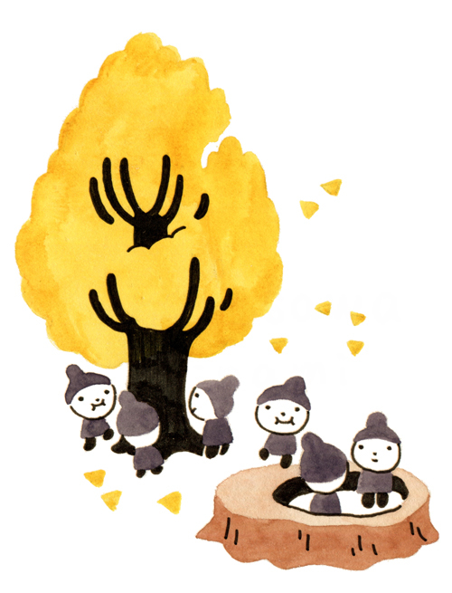 ._. 6+others :i ambiguous_gender artist_name autumn beanie branch child closed_mouth commentary_request dot_nose facing_away falling_leaves from_behind from_side grey_headwear hat hirasawa_minami leaf falling_leaves light_smile looking_at_viewer matching_outfits multiple_others no_lineart original other_focus outdoors pom_pom_(clothes) profile simple_background sitting on_tree_stump smile standing straight-on tree tree_stump walking white_background wide_shot wind