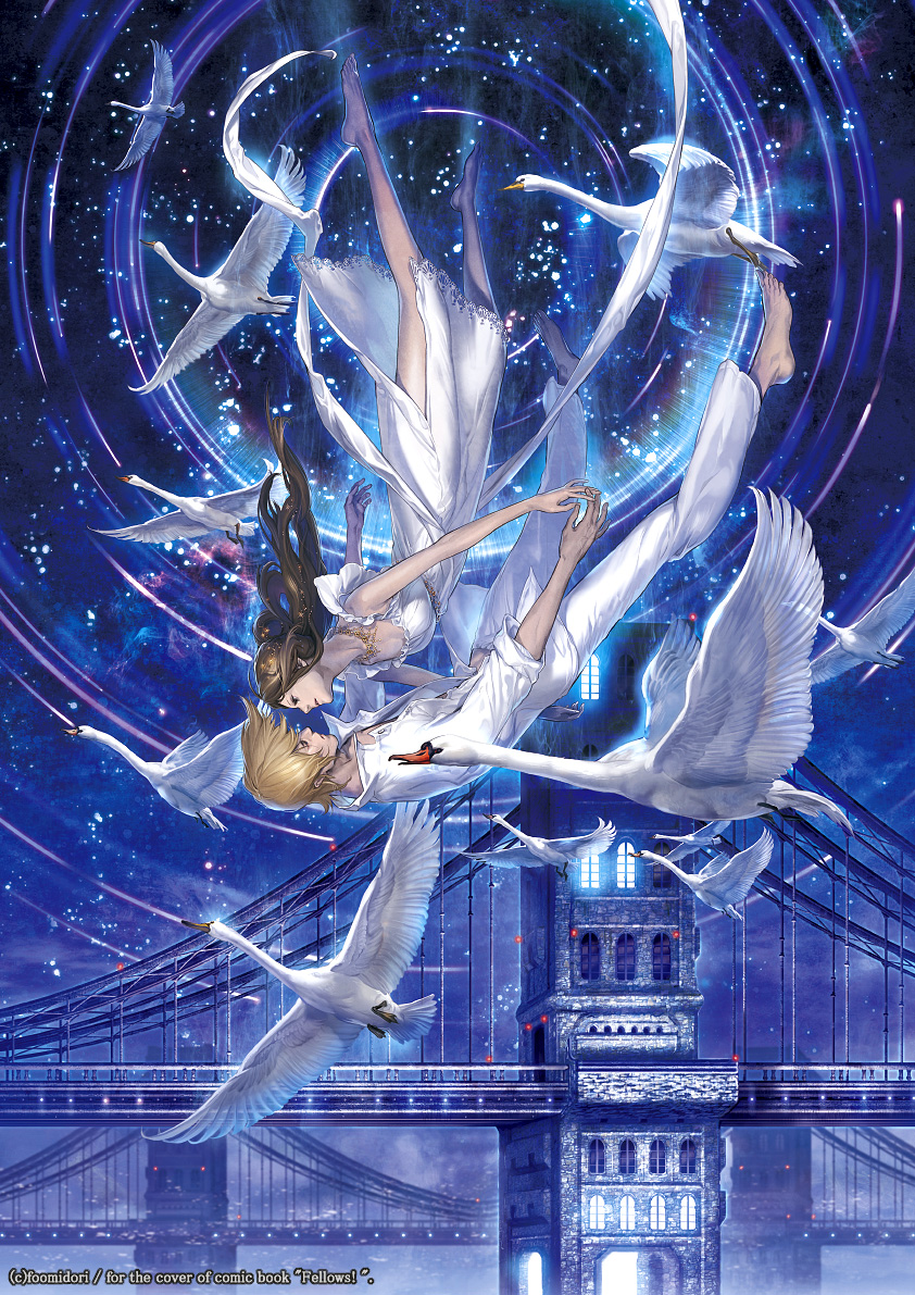 1boy 1girl barefoot bird brown_hair couple dress falling fellows! hetero long_hair midori_foo night short_hair sky