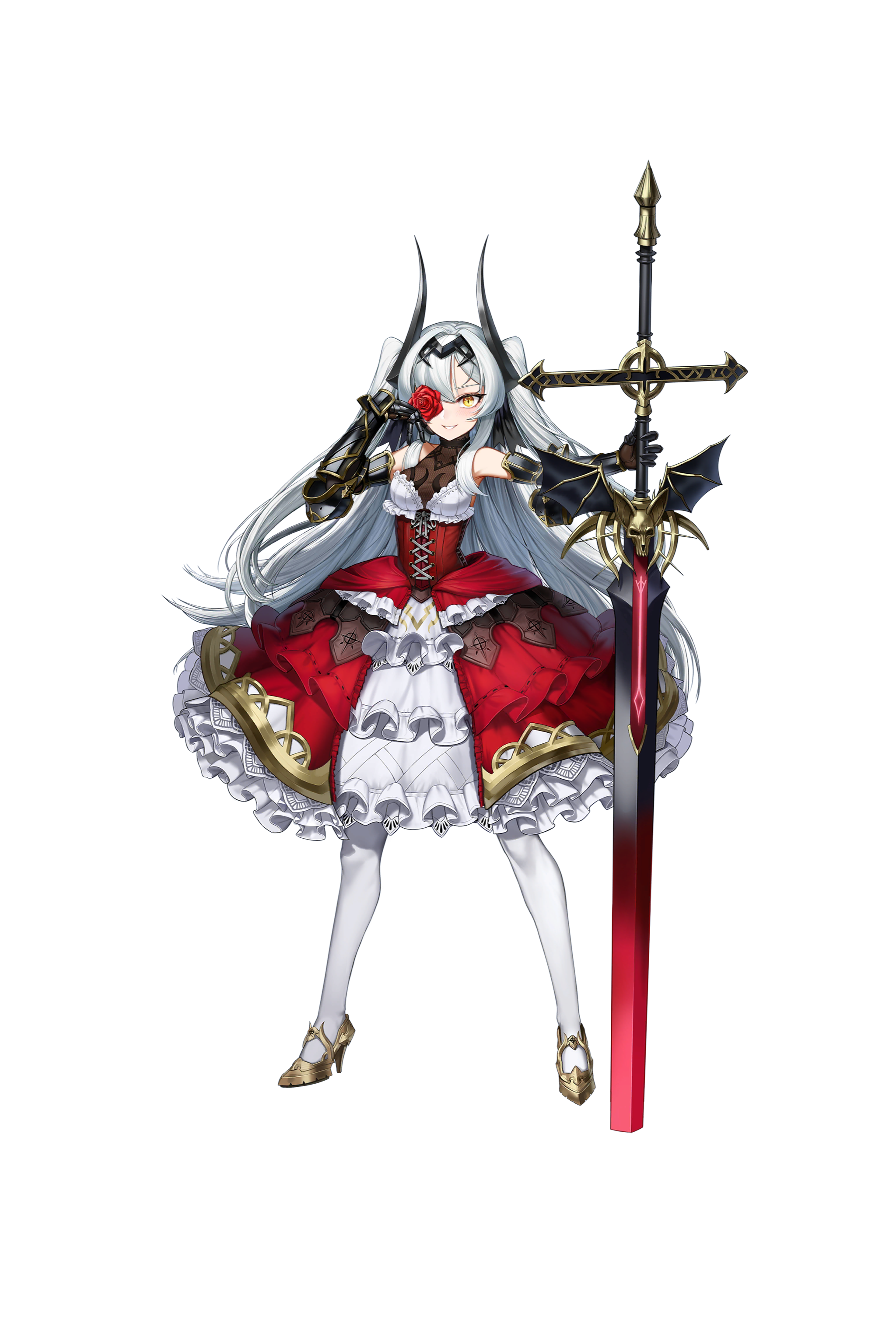1girl absurdres blush cyclops_princess_(last_origin) dress eyepatch full_body gauntlets gothic_lolita grin hair_intakes high_heels highres last_origin lolita_fashion long_hair mr.yun official_art pantyhose rose_eyepatch sanpaku silver_hair smile solo sword transparent_background twintails two_side_up very_long_hair weapon white_pantyhose yellow_eyes