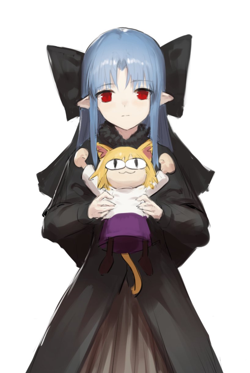 2girls :3 animal_ear_fluff animal_ears arms_up black_bow black_capelet black_dress black_eyes blue_hair bow cape capelet closed_mouth dress fur-trimmed_cape fur_trim hara_shoutarou highres holding holding_person large_bow light_blue_hair long_hair medium_hair melty_blood multiple_girls neco-arc purple_skirt red_eyes simple_background sketch skirt smile standing tsukihime white_background