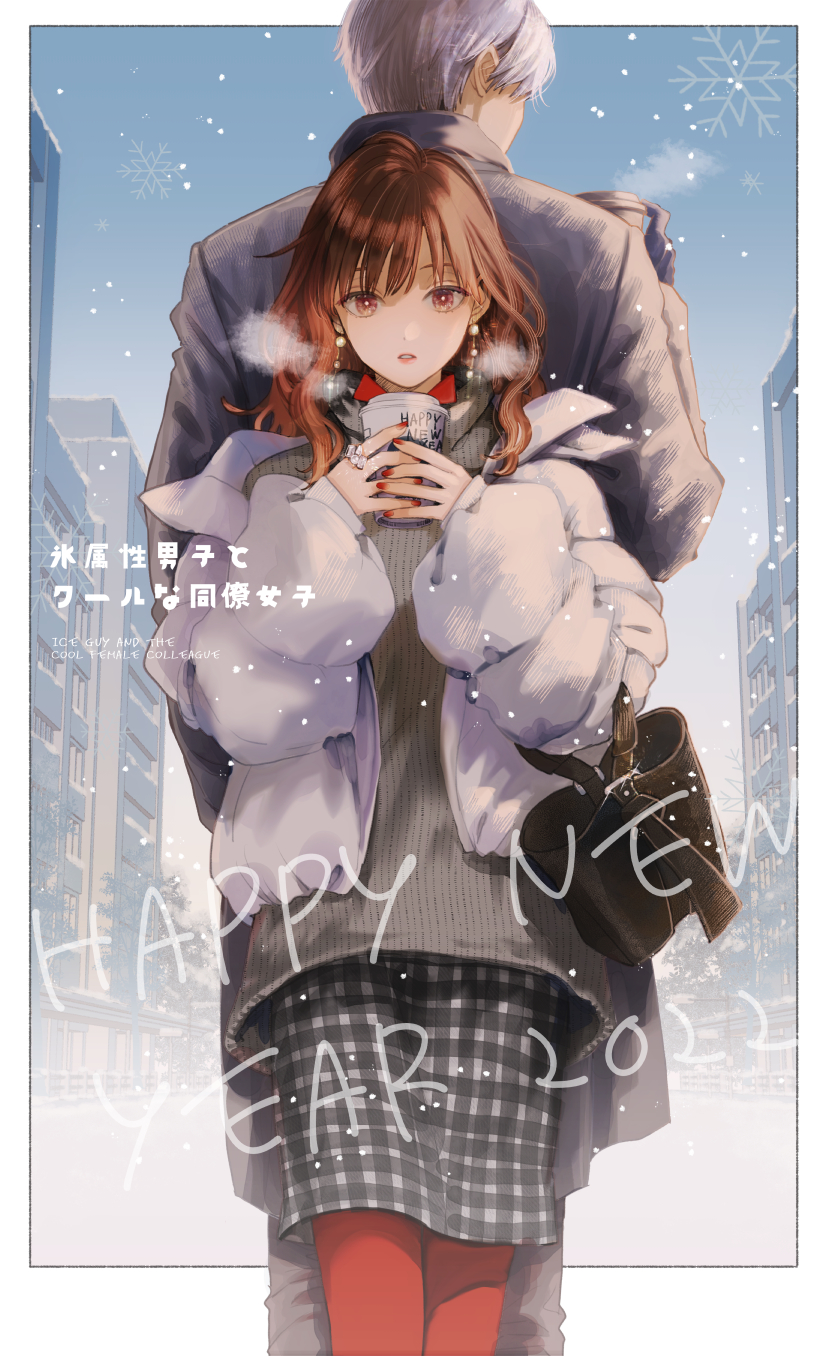 1boy 1girl 2022 back-to-back bow bowtie breath checkered_clothes checkered_skirt city cold cowboy_shot down_jacket earrings fuyutsuki_mio happy_new_year highres himuro_yukiya holding jacket jewelry koori_zokusei_danshi_to_cool_na_douryou_joshi lipstick looking_at_viewer makeup medium_hair nail_polish nengajou new_year outdoors pantyhose parted_lips red_bow red_nails red_pantyhose skirt snowflakes snowing standing sweater teeth tonogaya winter winter_clothes