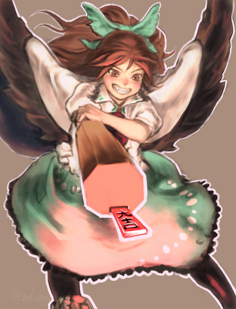 1girl arm_cannon black_legwear bow brown_eyes brown_hair collared_shirt envenomist_(gengoroumaru) fangs foreshortening grin hair_bow hand_on_own_arm highres looking_ahead medium_skirt ponytail puffy_short_sleeves puffy_sleeves reiuji_utsuho shirt short_sleeves skirt smile solo teeth touhou weapon wind wings