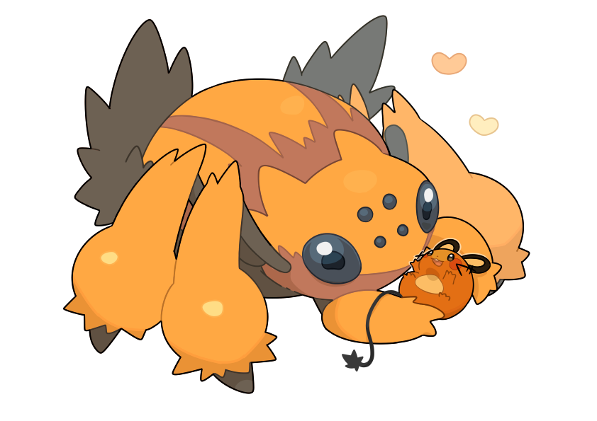 bug commentary_request dedenne galvantula gen_5_pokemon gen_6_pokemon heart holding holding_pokemon nintendo no_humans open_mouth pokemon pokemon_(creature) shuu_(ssyuu721) simple_background spider white_background yellow_fur