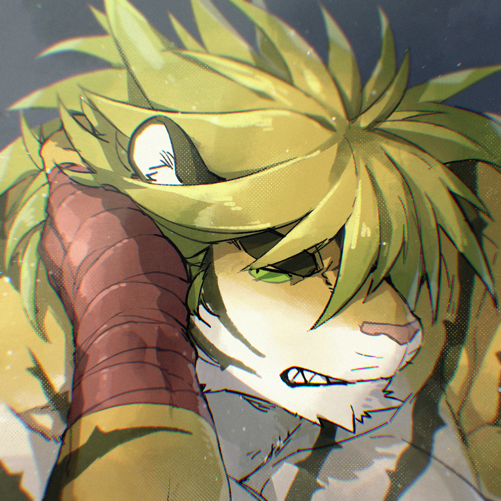1boy animal_ears bandaged_hand bandages bara blonde_hair close-up colored_sclera furry furry_male green_sclera hand_in_own_hair highres jinnai10 long_hair macan_(housamo) male_focus muscular muscular_male pectorals solo thick_eyebrows tiger_boy tiger_ears tokyo_houkago_summoners yellow_fur