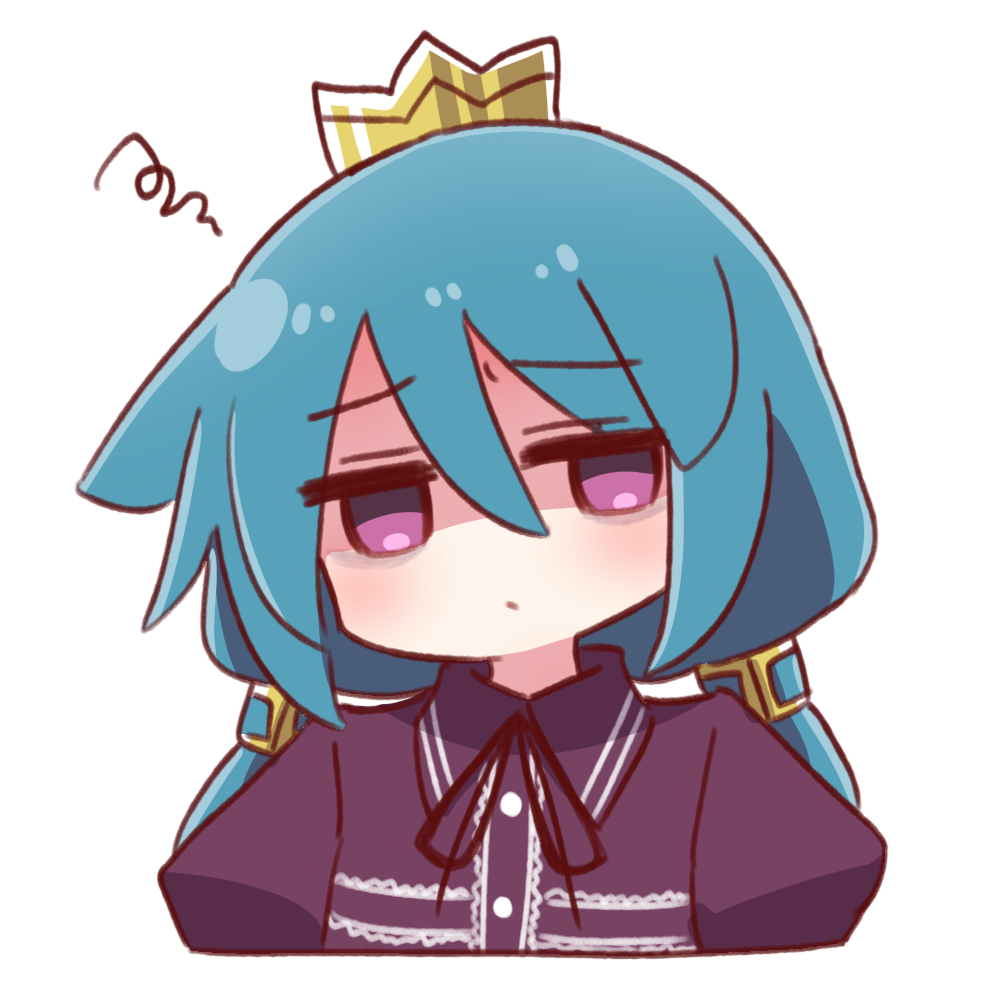 1girl 7th_dragon 7th_dragon_(series) black_ribbon blue_hair closed_mouth collared_shirt commentary_request cropped_torso crown dress_shirt hair_between_eyes head_tilt long_hair looking_at_viewer low_twintails mini_crown momomeno_(7th_dragon) naga_u neck_ribbon princess_(7th_dragon) puffy_sleeves purple_eyes purple_shirt ribbon shaded_face shirt simple_background solo squiggle twintails upper_body white_background