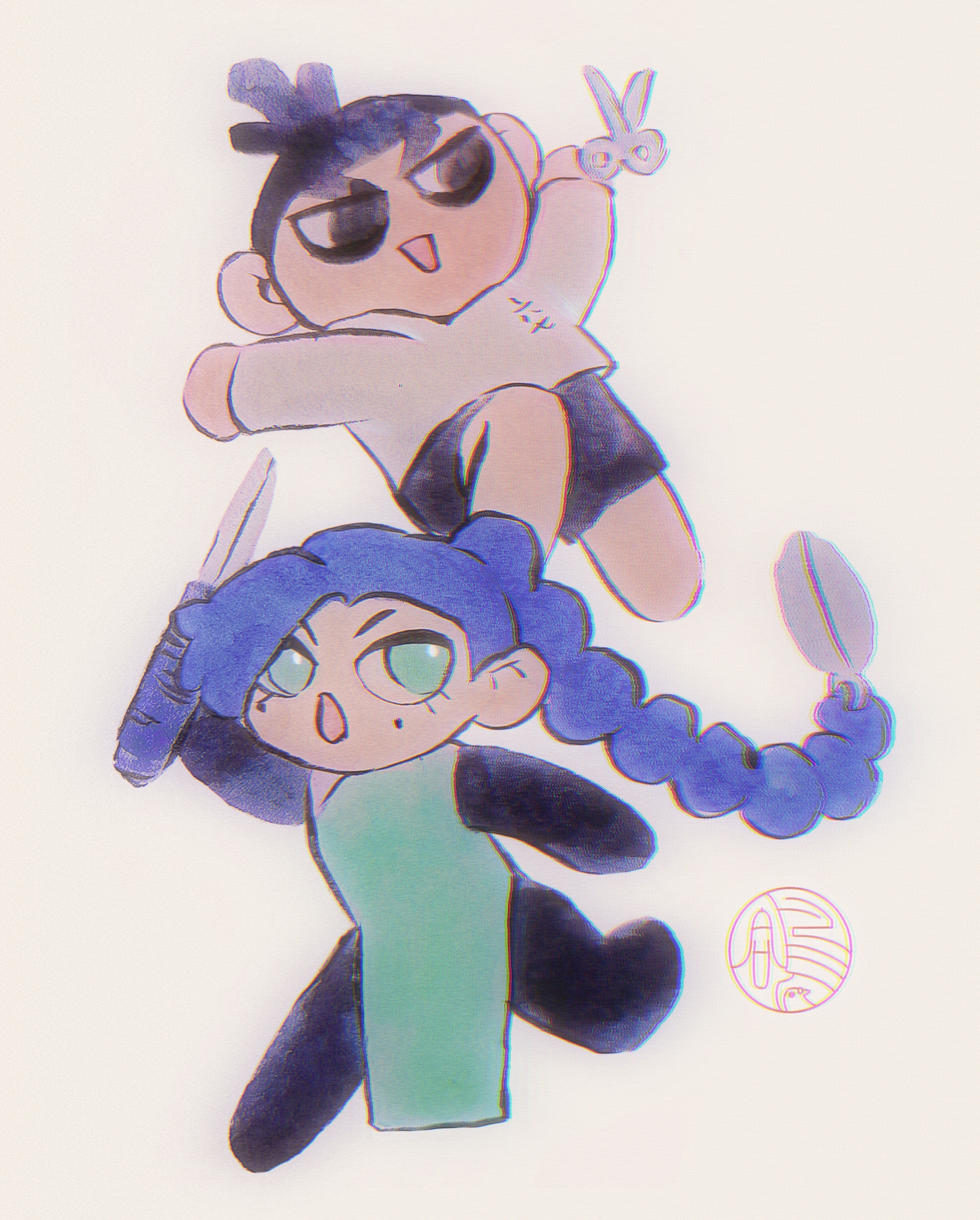 1boy 1girl absurdly_long_hair absurdres arm_up arms_up artist_name asymmetrical_hair barefoot black_bodysuit black_eyes black_hair black_shorts blue_hair blunt_bangs bodysuit bodysuit_under_clothes braid braided_ponytail chibi china_dress chinese_clothes chinese_text clothes_writing dagger dress flat_chest full_body godzillapigeon1 green_dress green_eyes happy highres holding holding_dagger holding_knife holding_scissors holding_weapon jumping knife leg_up long_hair looking_to_the_side matching_hair/eyes mole mole_under_eye open_mouth running scissor_seven scissors seven_(scissor_seven) shirt short_hair shorts side_ponytail signature simple_background single_braid sleeveless sleeveless_dress smile thick_eyebrows thirteen_(scissor_seven) topknot translation_request v-shaped_eyebrows very_long_hair weapon white_background white_shirt