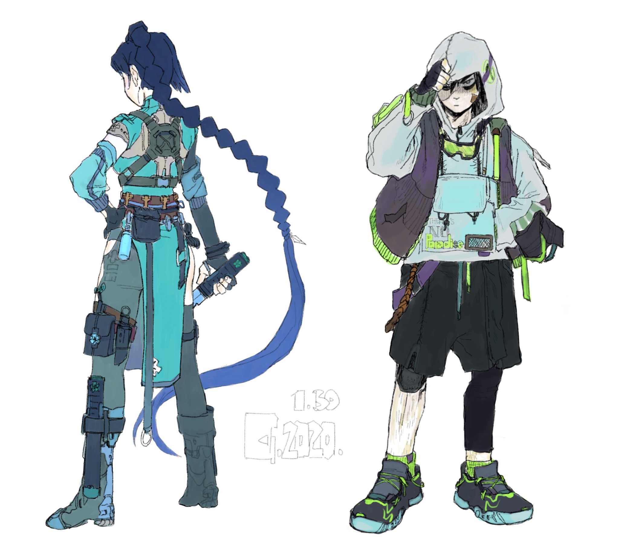 1boy 1girl absurdly_long_hair adjusting_hood alternate_costume arm_up artist_name asymmetrical_clothes asymmetrical_hair bandaid bandaid_on_face black-framed_eyewear black_eyes black_hair black_pants black_shorts blue_hair blue_sleeves boots braid braided_ponytail breasts chain closed_mouth clothes_writing cyberpunk dagger dated detached_sleeves drawstring dress elbow_gloves english_text eyewear_around_neck from_behind full_body gloves godzillapigeon1 goggles green-tinted_eyewear green_dress grey_legwear grey_sweater hair_between_eyes hand_in_pocket hand_on_own_hip harness highres holding holding_dagger holding_knife holding_weapon hood hood_up hoodie knee_pads knife leg_hair long_hair long_sleeves looking_at_viewer monochrome multicolored_footwear open_clothes open_vest pants pants_under_shorts pelvic_curtain pocket purple_vest scissor_seven seven_(scissor_seven) sheath sheathed shoes short_hair short_sleeves shorts side_ponytail signature simple_background single_braid single_pantsleg small_breasts sneakers socks standing sweater thigh_strap thirteen_(scissor_seven) tinted_eyewear very_long_hair vest weapon white_background zipper