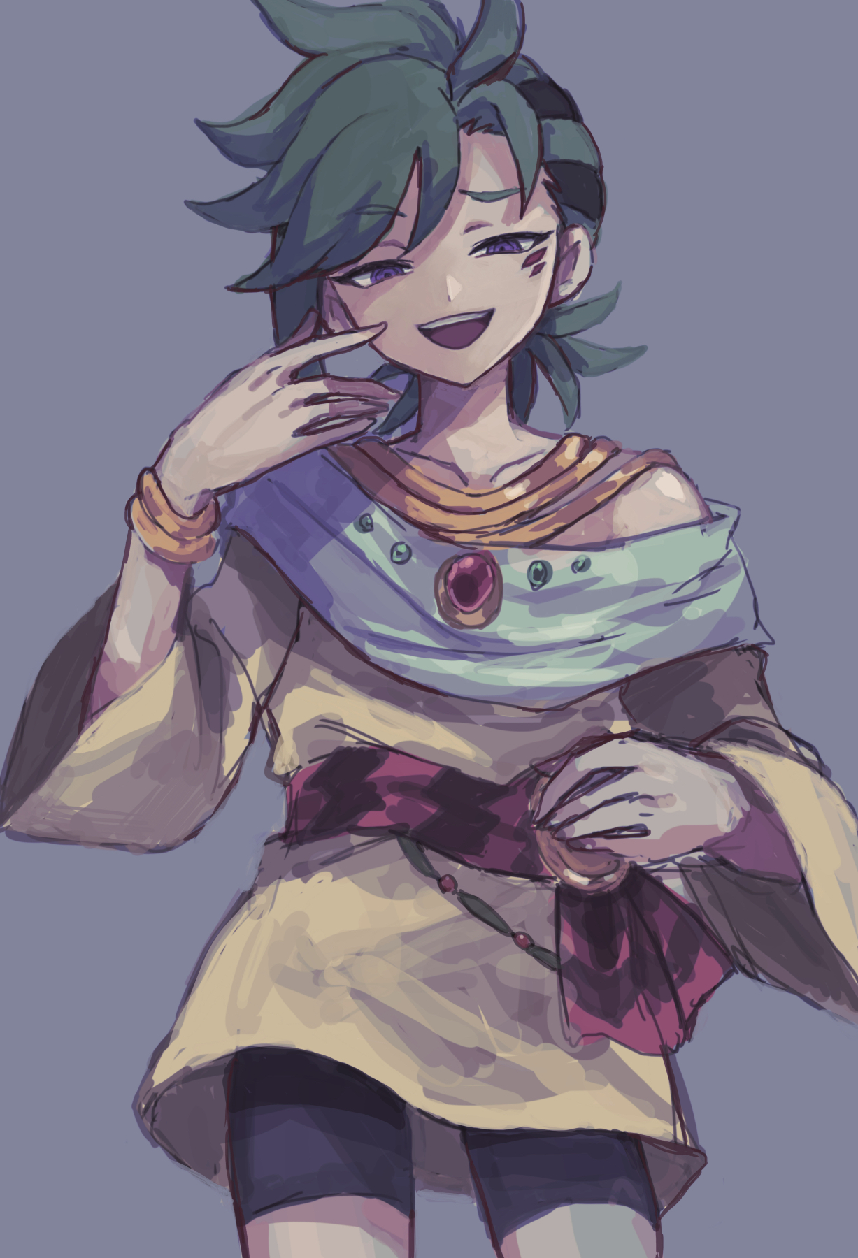 1boy bad_id bad_pixiv_id bike_shorts black_hair boots facial_mark green_hair highres jewelry looking_at_viewer mauro_abelard multicolored_hair o_(rcmv4552) off_shoulder open_mouth purple_eyes shadowverse_(anime) smile solo spiked_hair tunic two-tone_hair yellow_tunic