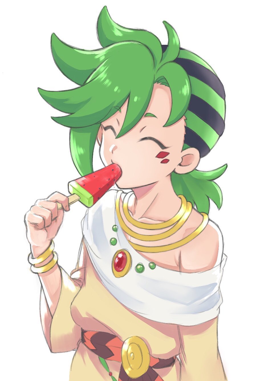1boy black_hair eating facial_mark food green_hair hair_between_eyes highres holding holding_food jewelry male_focus mauro_abelard multicolored_hair necklace off_shoulder popsicle riku_son shadowverse shadowverse_(anime) simple_background solo spiked_hair trap tunic two-tone_hair watermelon_bar white_background yellow_tunic