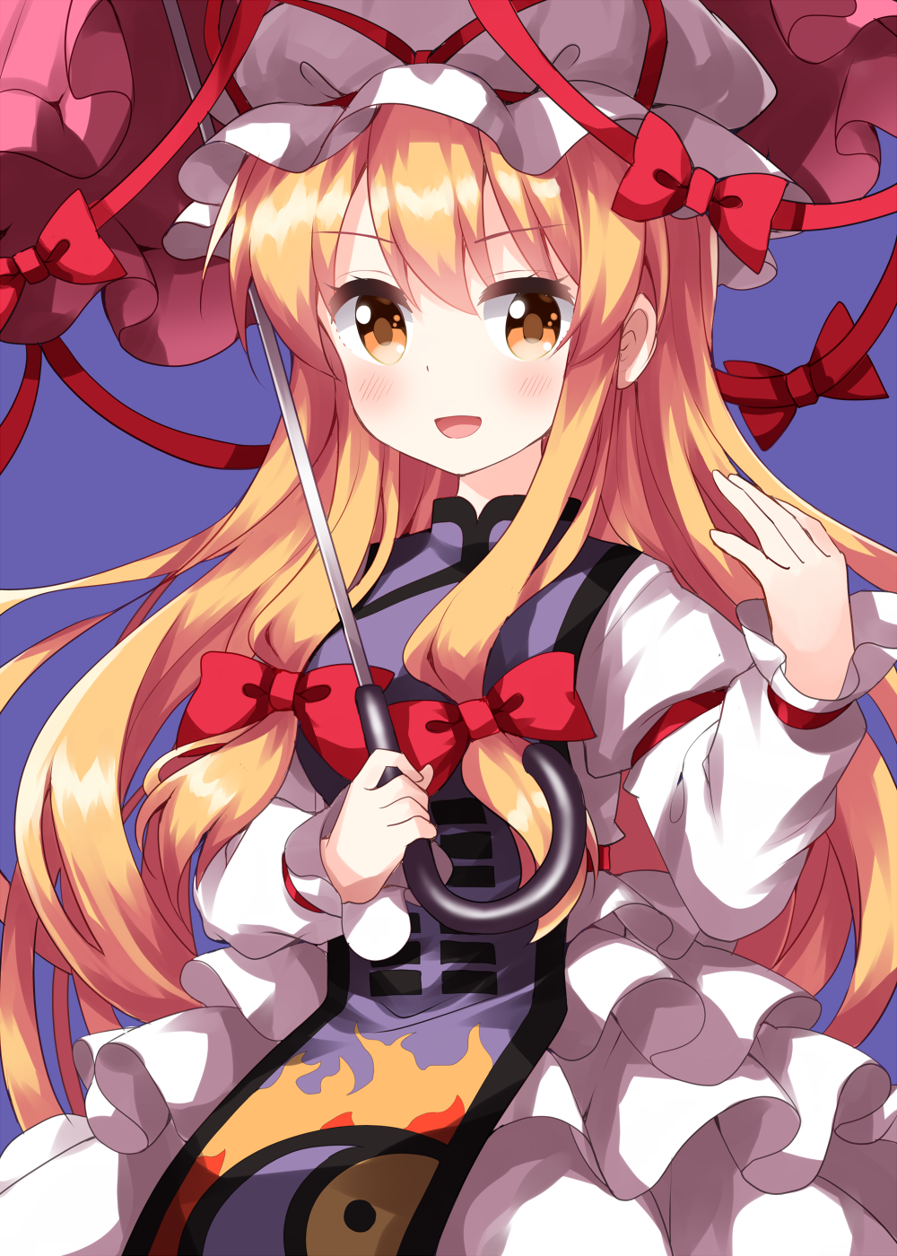 1girl blonde_hair blush bow dress hair_between_eyes hat hat_ribbon highres holding holding_umbrella long_hair long_sleeves mob_cap open_mouth pink_umbrella purple_background red_bow red_ribbon ribbon ruu_(tksymkw) sidelocks simple_background smile solo tabard touhou trigram umbrella upper_body white_dress white_hat yakumo_yukari yellow_eyes yin_yang yin_yang_print