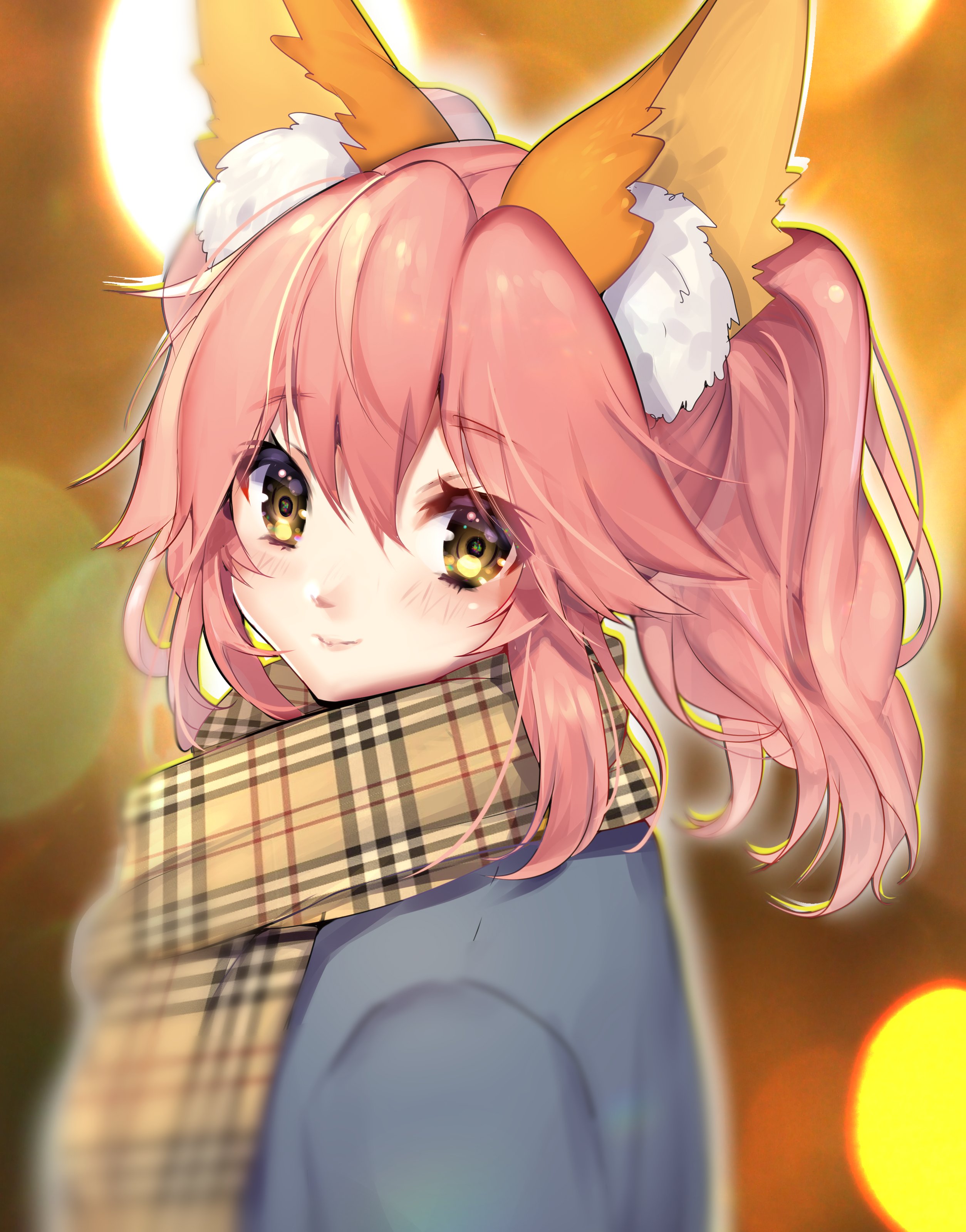 1girl absurdres animal_ear_fluff animal_ears blurry blurry_background blurry_foreground closed_mouth commentary fate_(series) fox_ears fox_girl hair_between_eyes highres light_blush light_smile looking_at_viewer mogullaz official_alternate_costume pink_hair plaid_clothes plaid_scarf scarf sidelocks solo split_ponytail tamamo_jk_(fate) tamamo_no_mae_(fate) upper_body winter_clothes yellow_eyes