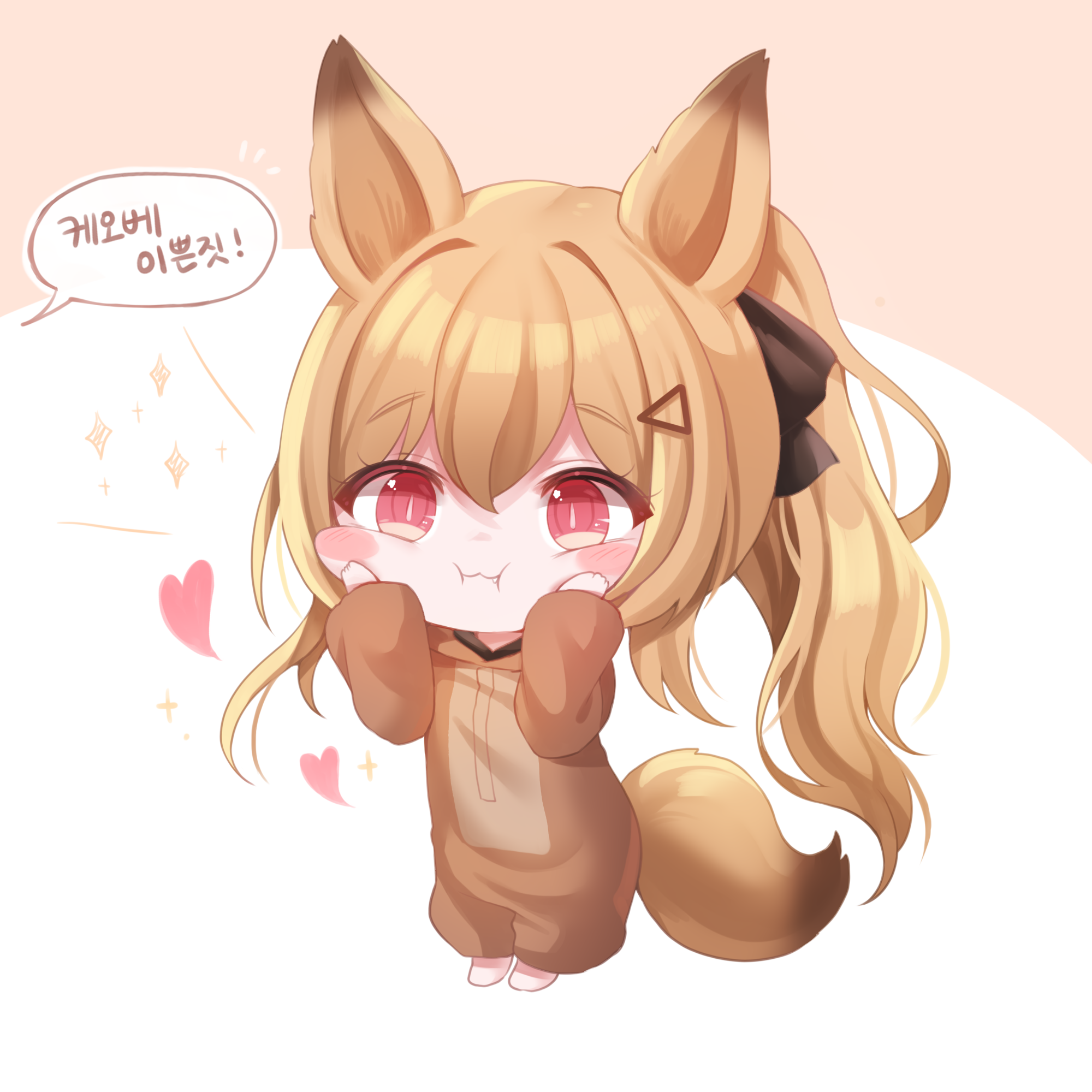1girl alternate_hairstyle animal_ears arknights barefoot black_ribbon blonde_hair blush_stickers bow brown_pajamas ceobe_(arknights) chibi closed_mouth commentary_request dog_ears dog_tail fang fang_out hair_between_eyes hair_bow hair_ornament hair_ribbon hairclip hands_on_own_cheeks hands_on_own_face heart highres honyang korean_text long_hair long_sleeves notice_lines official_alternate_costume orange_background pajamas ponytail red_eyes ribbon smile solo speech_bubble squishing star_(symbol) tail white_background