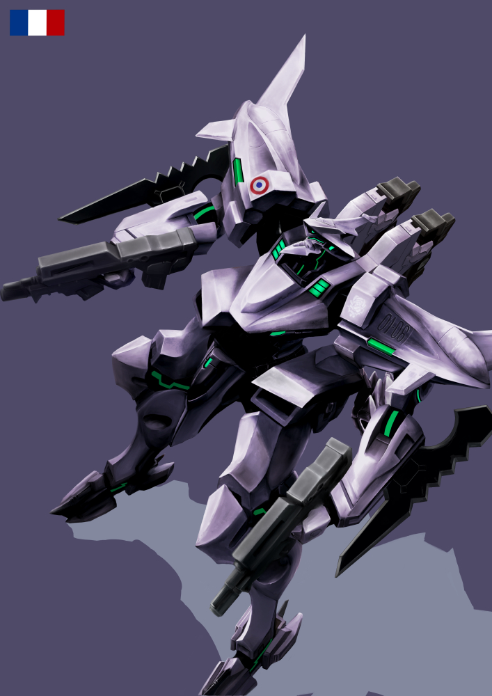 blade cannon french_flag gradient_background grey_background gun hiwa_industry machine_gun mecha muv-luv muv-luv_alternative no_humans rafale_(muv-luv) robot shadow tactical_surface_fighter thrusters weapon