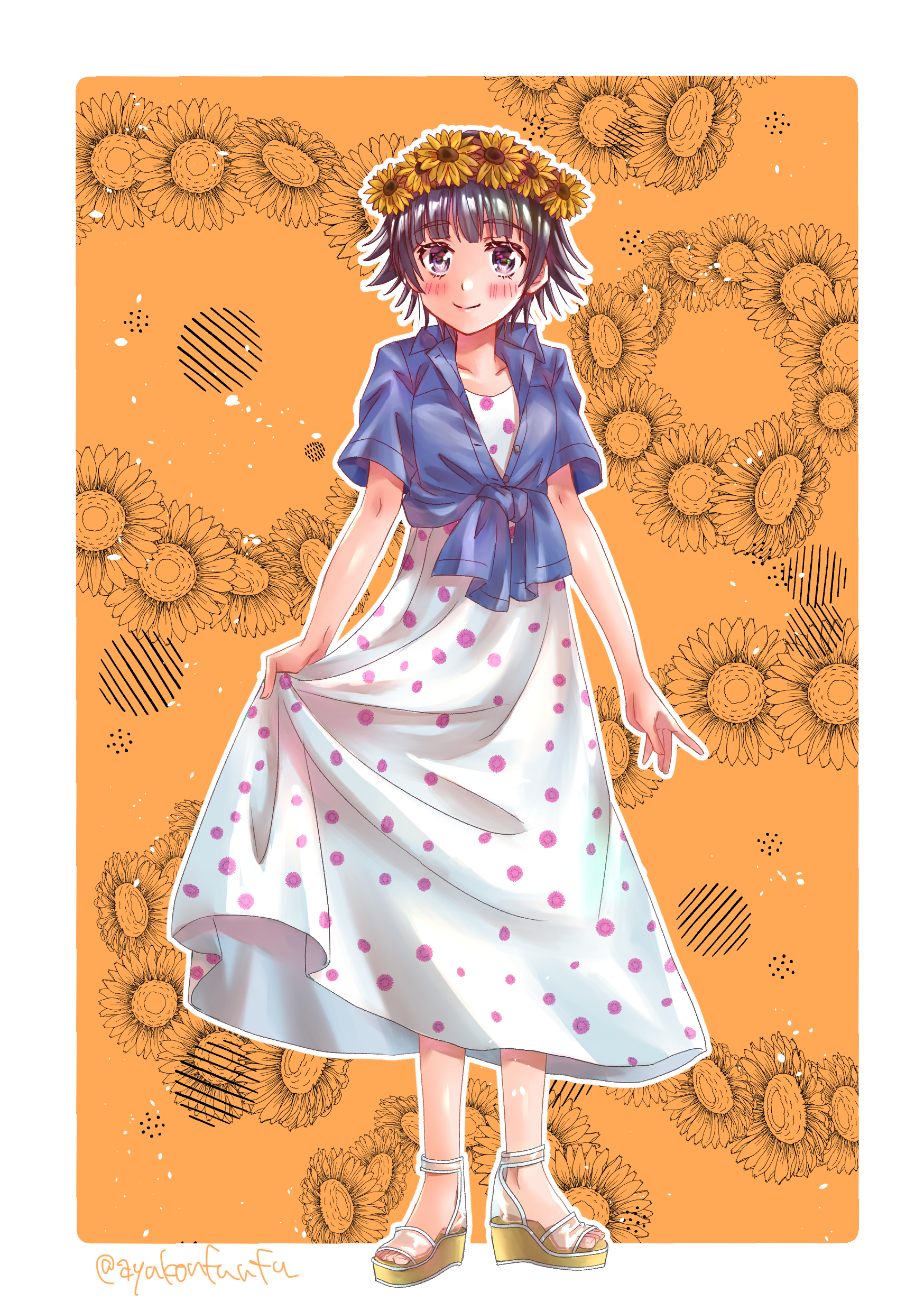 1girl absurdres ayuko_(ayuko54bornthisway) black_eyes black_hair blue_shirt blush border closed_mouth collared_shirt dress dress_shirt flower full_body hair_flower hair_ornament head_wreath highres holding_own_dress long_dress looking_at_viewer open_clothes open_shirt orange_background outline outside_border print_dress shiny_skin shirt short_hair short_sleeves smile solo standing sundress sunflower toaru_kagaku_no_railgun toaru_majutsu_no_index uiharu_kazari white_border white_dress wing_collar yellow_flower