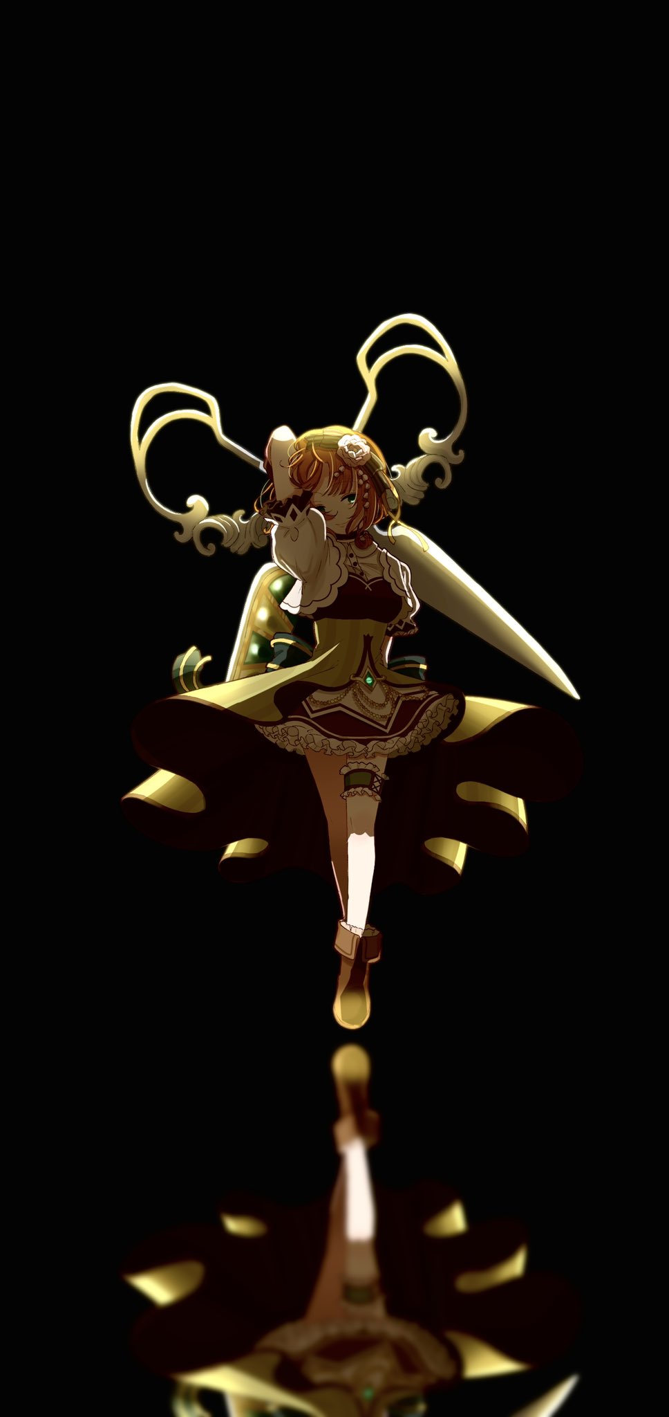 1girl black_background brown_hair dark haruna_konomi highres holding holding_scissors magia_record:_mahou_shoujo_madoka_magica_gaiden magical_girl mahou_shoujo_madoka_magica maji_0023 petals reflection reflective_floor scissors short_hair short_sleeves solo