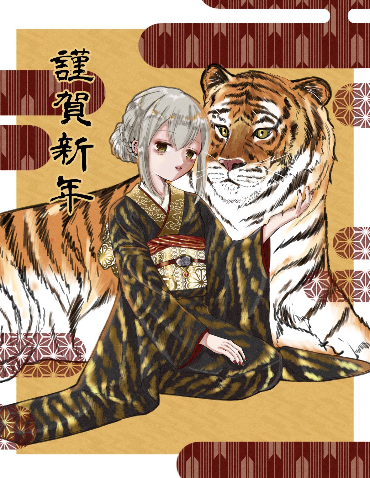1girl alternate_hairstyle hair_bun highres japanese_clothes kimono kureha_yuna magia_record:_mahou_shoujo_madoka_magica_gaiden mahou_shoujo_madoka_magica maji_0023 new_year seiza single_hair_bun sitting solo tiger white_hair yellow_eyes