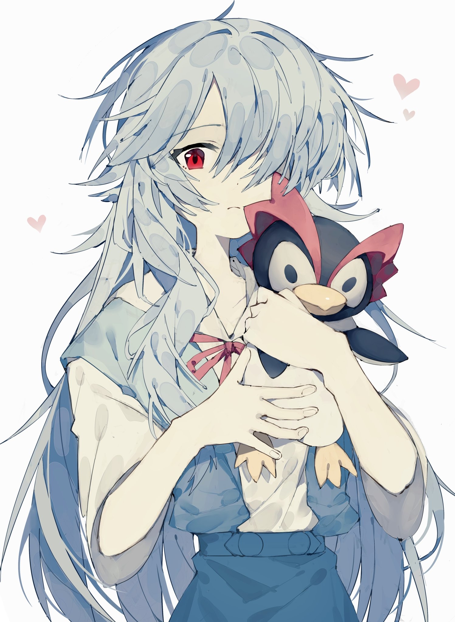 1girl alternate_hair_length alternate_hairstyle ayanami_rei blue_hair blue_skirt closed_mouth commentary_request deep_(deep4946) evangelion:_3.0+1.0_thrice_upon_a_time hair_over_one_eye heart highres holding holding_stuffed_toy long_hair looking_at_viewer neck_ribbon neon_genesis_evangelion penpen rebuild_of_evangelion red_eyes red_ribbon ribbon school_uniform shirt short_sleeves simple_background skirt solo stuffed_animal stuffed_penguin stuffed_toy suspender_skirt suspenders tokyo-3_middle_school_uniform upper_body white_background white_shirt
