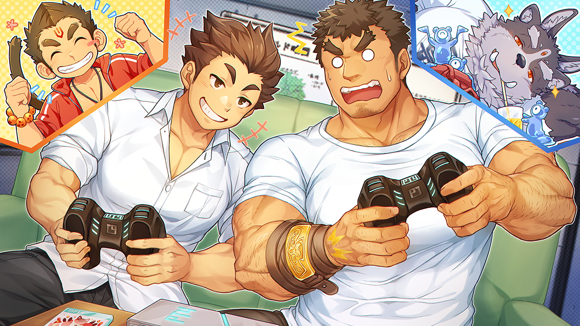 4boys abs animal_ears bara belt blush brown_hair chest_hair controller couch covered_abs extra_ears facial_hair fat fat_man furry furry_male game_console game_controller goatee gozu_farm grin hanuman_(housamo) takabushi_kengo large_pectorals long_sideburns male_focus multiple_boys muscular muscular_male o_o official_art pectoral_cleavage pectorals protagonist_(f-kare) shirt short_hair sideburns smile stubble thick_eyebrows tokyo_houkago_summoners tsathoggua_(housamo) tusks white_shirt wolf_ears