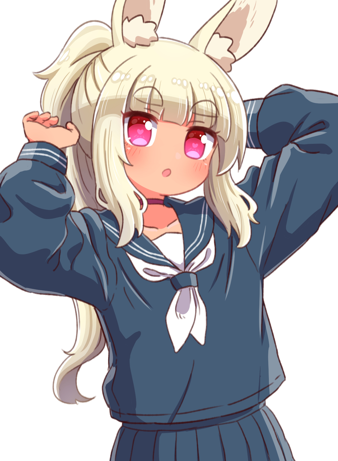 1girl :o animal_ear_fluff animal_ears arms_up blonde_hair blue_sailor_collar blue_serafuku blue_shirt blue_skirt blunt_bangs blush bright_pupils choker collarbone cowboy_shot double_horizontal_stripe etrian_odyssey flipped_hair heart heart-shaped_pupils highres long_hair long_sleeves looking_at_viewer masurao_(sekaiju) masurao_2_(sekaiju) naga_u neckerchief open_mouth pleated_skirt ponytail rabbit_ears red_choker red_eyes sailor_collar school_uniform sekaiju_no_meikyuu sekaiju_no_meikyuu_5 serafuku shirt sidelocks simple_background skirt solo symbol-shaped_pupils thick_eyebrows very_long_hair white_background white_neckerchief