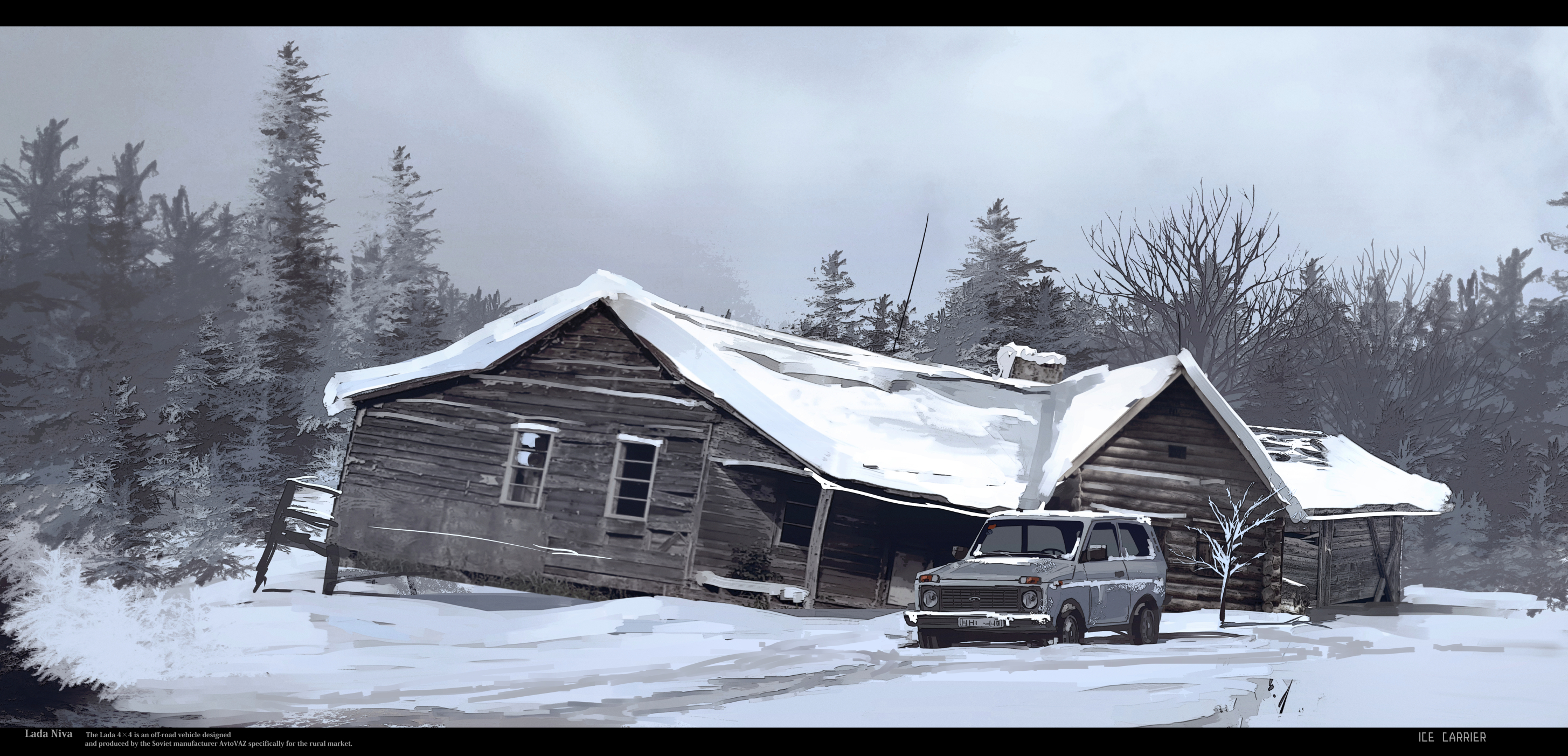 cabin car chinese_commentary commentary_request english_text forest haguruma_c highres lada_(car) lada_niva letterboxed motor_vehicle nature no_humans original scenery snow sports_utility_vehicle tree