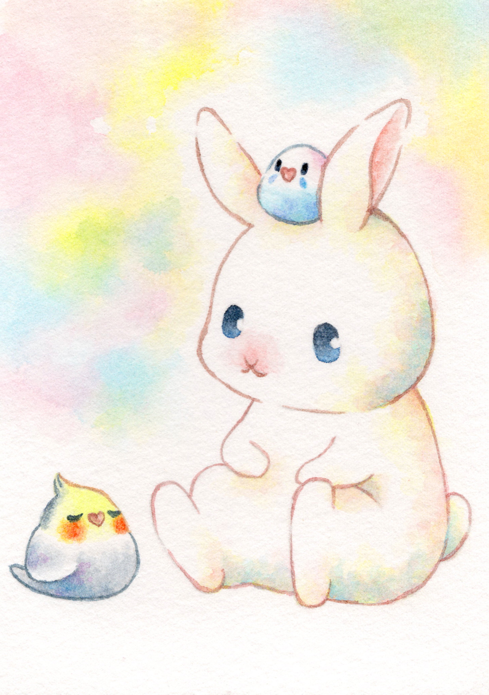 :3 animal animal_focus bird blue_eyes chibi chibi_on_head closed_eyes closed_mouth commentary_request ears_up highres looking_at_another multicolored_background no_humans on_head original painting_(medium) rabbit simple_background sinsousui sitting traditional_media watercolor_(medium) white_background