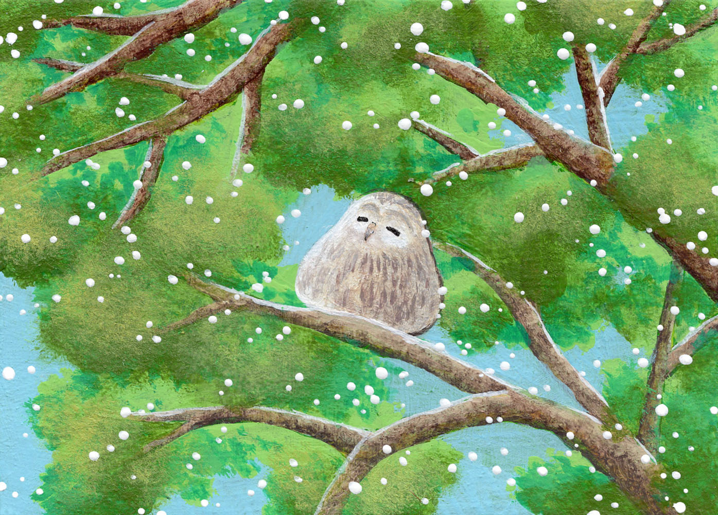 animal animal_focus bird blue_sky branch chibi commentary_request closed_eyes foliage no_humans original owl painting_(medium) sinsousui sitting sky traditional_media tree watercolor_(medium)