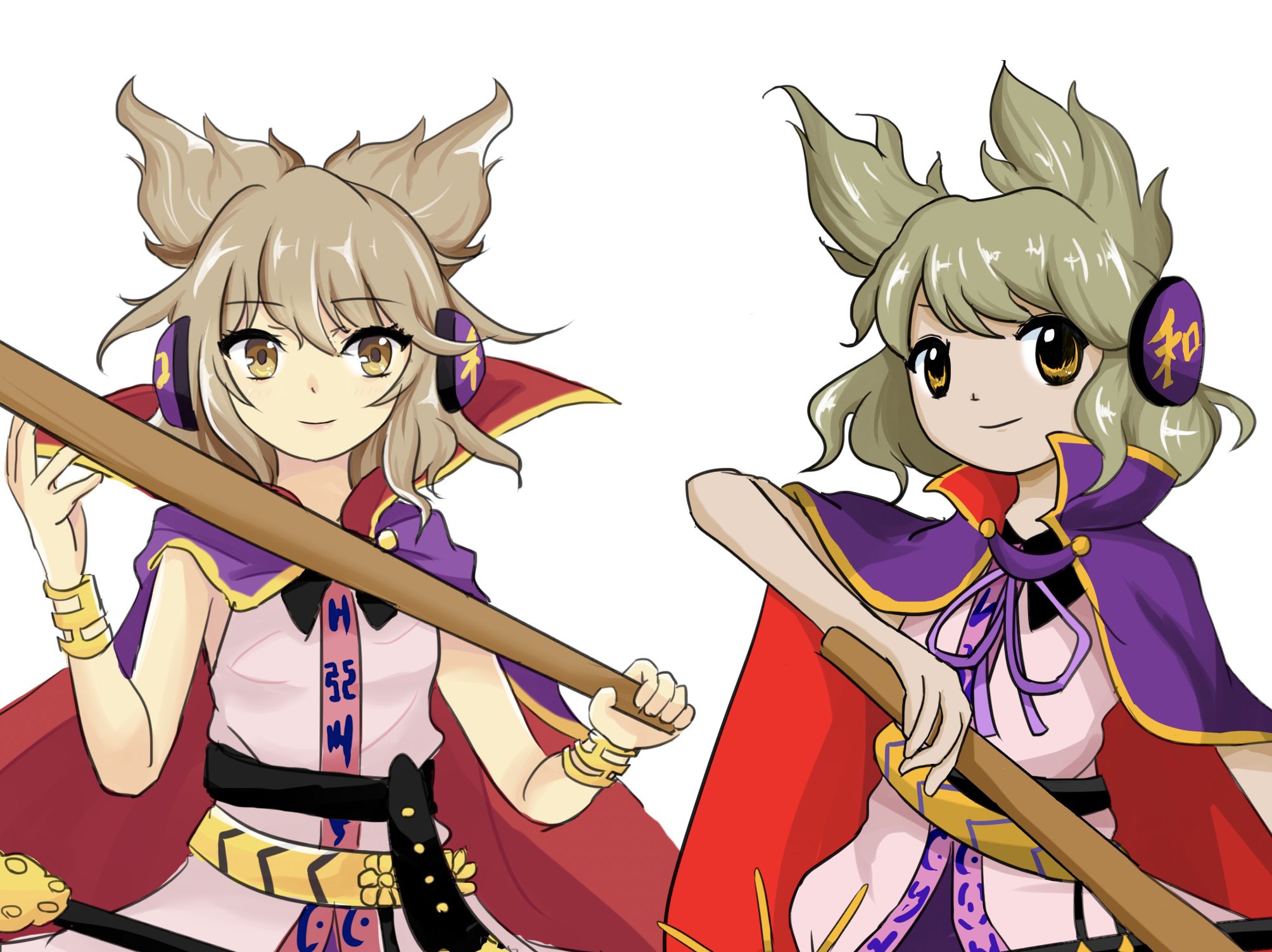 2girls cape comparison earmuffs gold_trim highres holding kaisouou_konbu light_brown_hair light_smile looking_at_viewer medium_hair multiple_girls pointy_hair ritual_baton sheath sheathed simple_background sword touhou toyosatomimi_no_miko upper_body weapon white_background yellow_eyes zun_(style)
