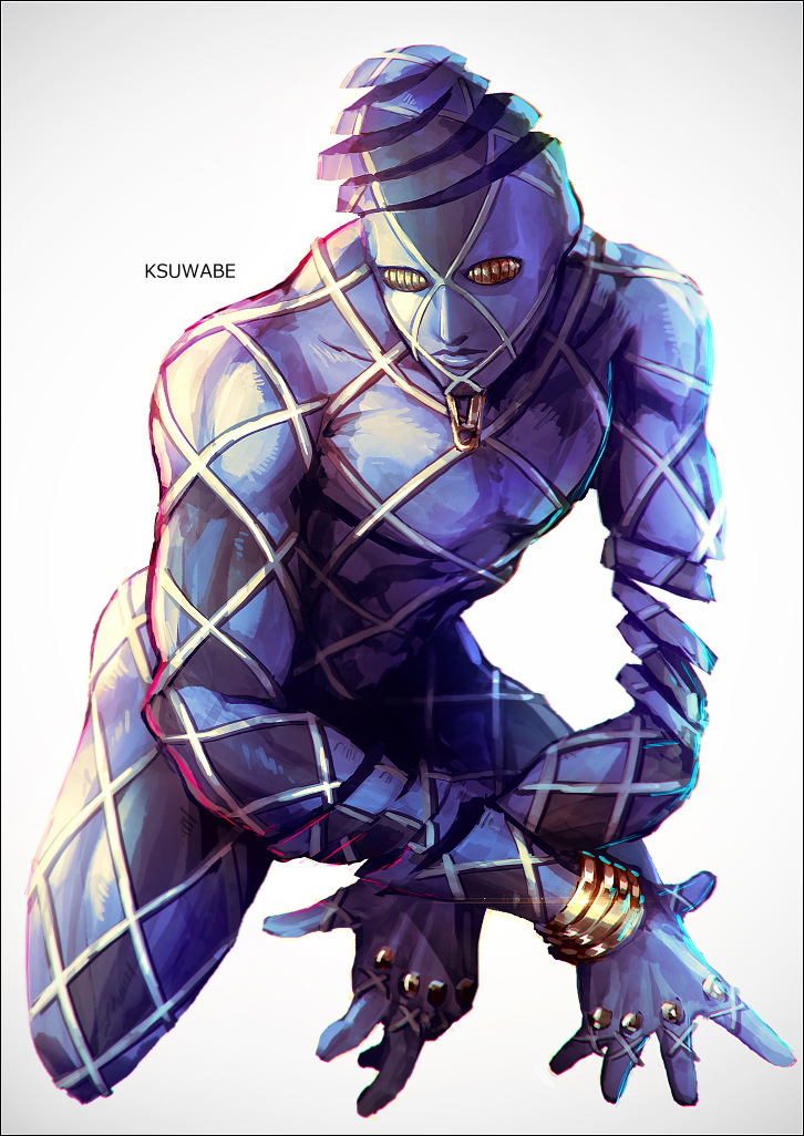 1other artist_name bracelet closed_mouth colored_skin diamond_wa_kudakenai full_body highway_star_(stand) jewelry jojo_no_kimyou_na_bouken jojo_pose k-suwabe no_humans purple_skin solo stand_(jojo) white_background yellow_eyes