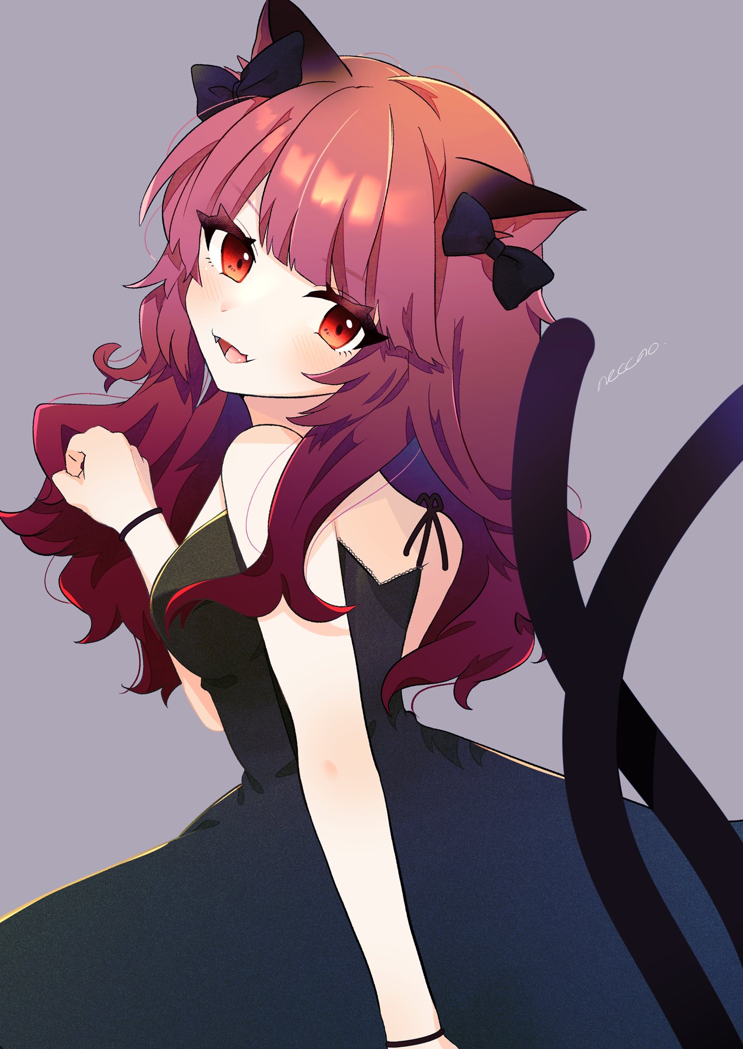 1girl alternate_hairstyle animal_ears arm_at_side armband black_bow black_dress blunt_bangs blush bow breasts cat_ears clenched_hand commentary dress fangs from_side grey_background hair_bow hair_down head_tilt highres kaenbyou_rin long_hair looking_at_viewer medium_breasts multiple_tails necono_(nyu6poko) nekomata open_mouth red_eyes red_hair signature simple_background solo tail tongue touhou tsurime two_tails upper_body wavy_hair