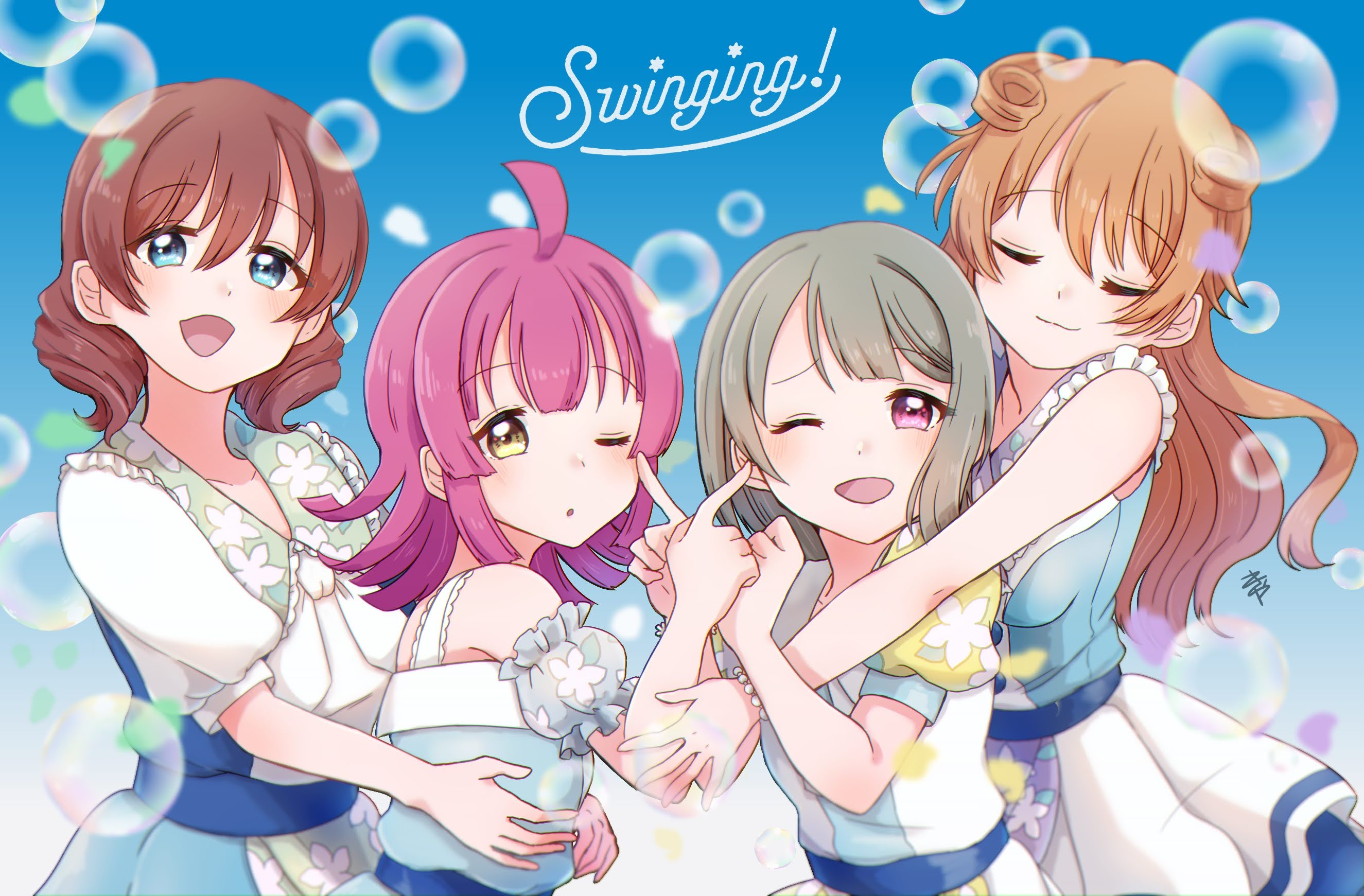 4girls ;) aqua_dress aqua_eyes artist_name artist_request bare_shoulders blue_background blue_corset blue_eyes blue_skirt blunt_bangs blush bow bowtie bracelet breasts brown_hair bubble buttons cleavage closed_eyes collarbone corset double_bun dress drill_hair emma_verde female_focus flower flower_print grey_hair hair_between_eyes hair_bun highres hug jewelry konoe_kanata light_brown_hair long_hair looking_at_viewer love_live! love_live!_nijigasaki_high_school_idol_club love_live!_school_idol_festival miniskirt multiple_girls nakasu_kasumi one_eye_closed parted_lips pearl_bracelet pink_eyes pink_hair plaid_clothes plaid_dress plaid_skirt pleated pleated_dress pleated_skirt puffy_short_sleeves puffy_sleeves purple_eyes qu4rtz_(love_live!) short_hair short_sleeves skirt sleeveless sleeveless_dress smile swinging_(love_live!) tennoji_rina two-tone_skirt white_bow white_dress white_skirt wink yellow_eyes yellow_skirt