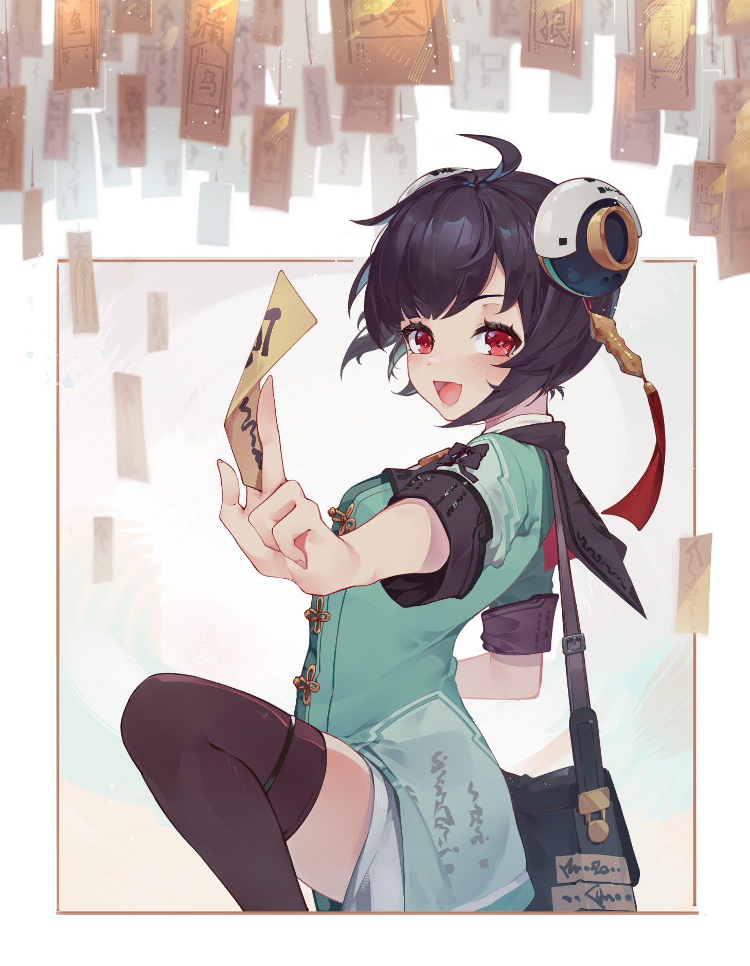 1girl :d ahoge ariakk bag between_fingers black_hair breasts brown_thighhighs chinese_commentary commentary_request cowboy_shot handbag highres holding holding_ofuda leg_lift light_blush looking_at_viewer ofuda ofuda_between_fingers open_mouth pulao:_dragontoll_(dragonwood)_(pgr) pulao:_dragontoll_(pgr) pulao_(pgr) punishing:_gray_raven red_eyes short_hair small_breasts smile solo standing standing_on_one_leg swept_bangs thighhighs