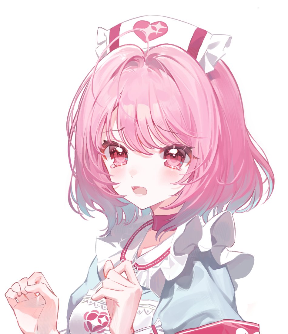 1girl :o ahoge blush bob_cut cheese765 dress fang furrowed_brow hair_intakes hat idolmaster idolmaster_cinderella_girls idolmaster_cinderella_girls_starlight_stage looking_at_viewer looking_to_the_side nurse_cap pinafore_dress pink_hair short_hair simple_background sleeveless_dress solo tears upper_body white_background yumemi_riamu