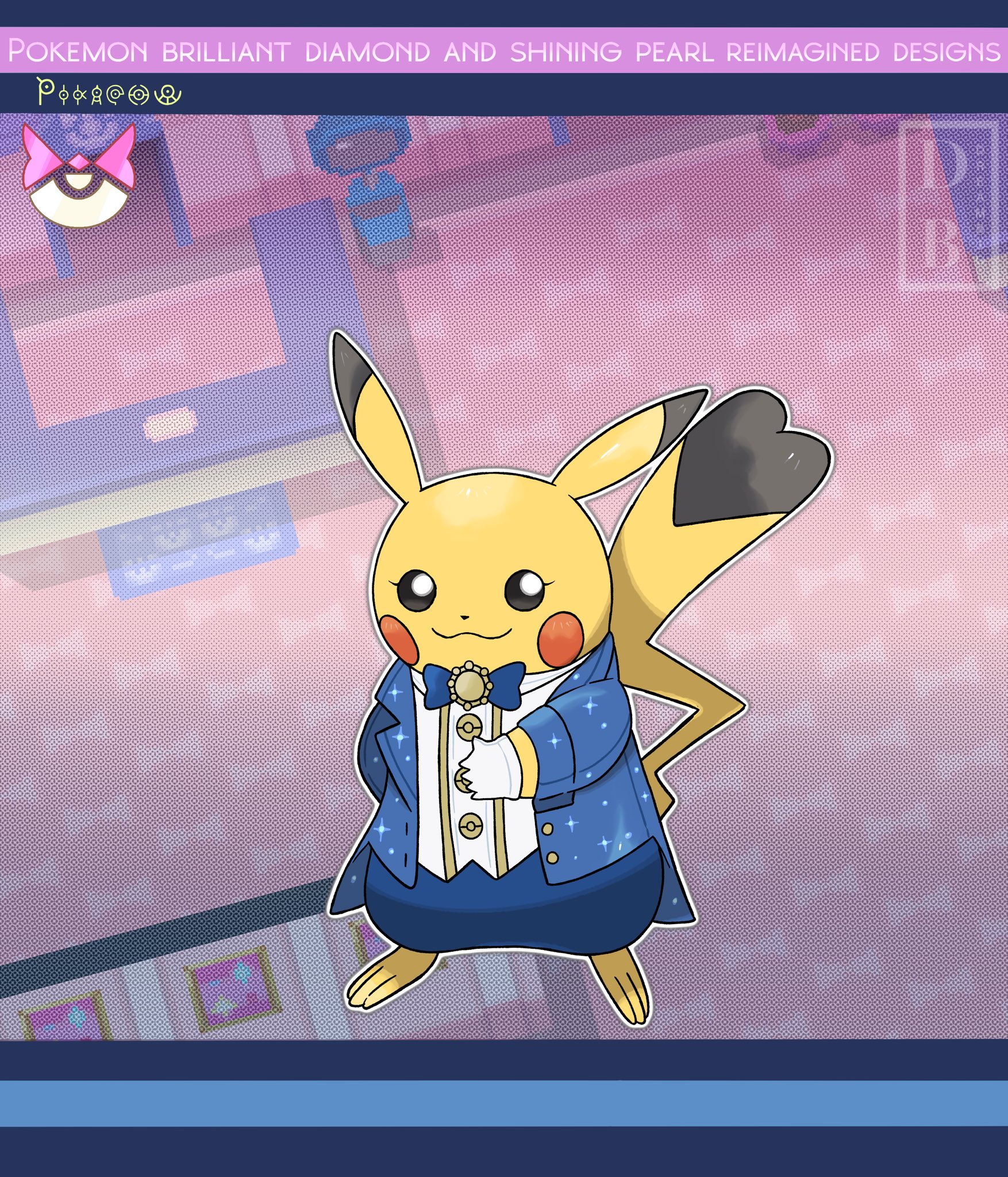 :3 black_eyes blue_bow blue_bowtie blue_pants bow bowtie buttons closed_mouth clothed_pokemon commentary copyright_name dreambig eyelashes full_body gen_1_pokemon gloves highres long_sleeves nintendo no_humans outline pants pikachu pokemon pokemon_(creature) pokemon_focus screenshot_inset smile solo tailcoat watermark white_gloves