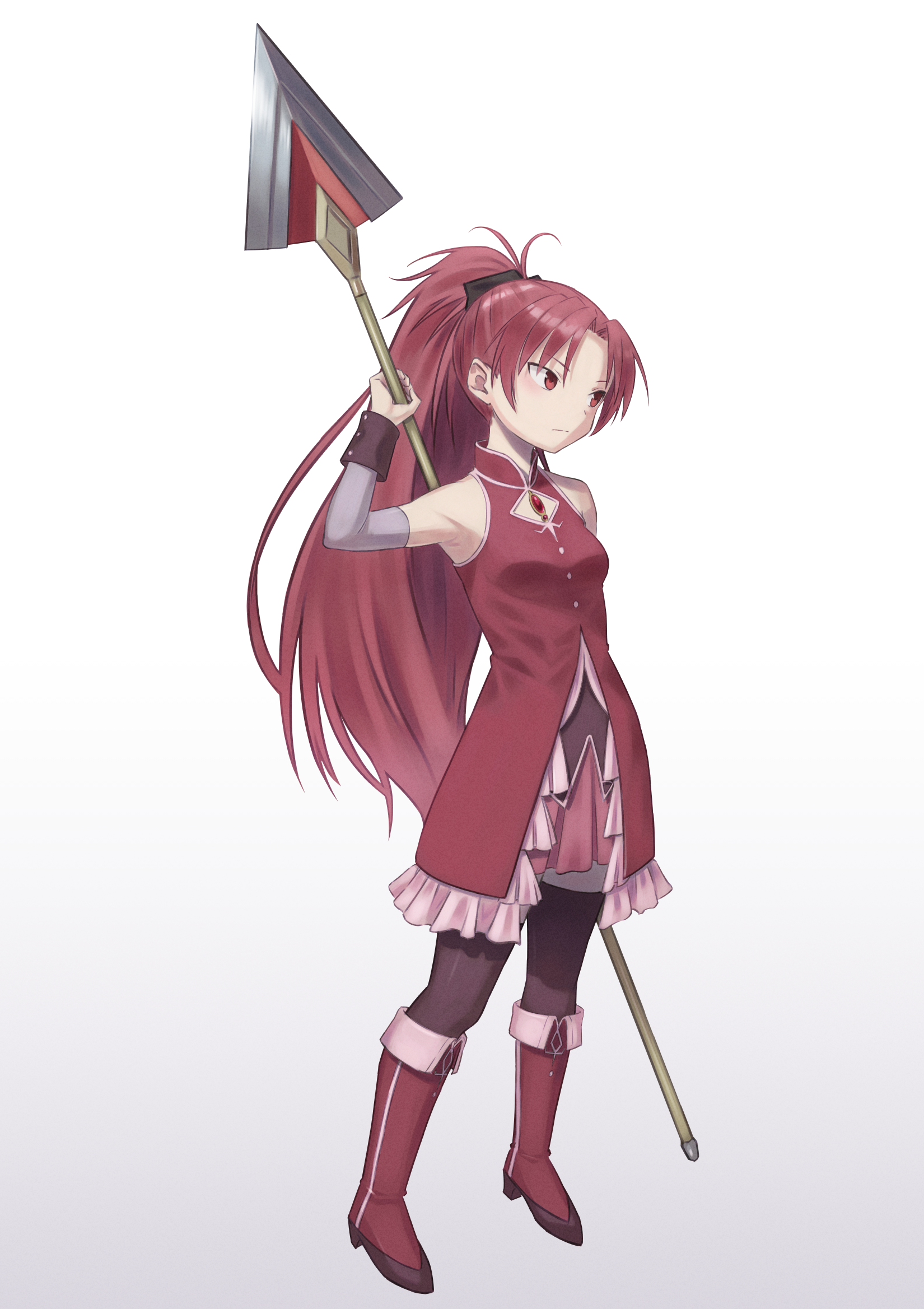 1girl armpits black_bow boots bow breast_cutouts breasts closed_mouth detached_sleeves dress frilled_dress frills full_body gradient_background hair_bow hair_ornament high_collar highres holding holding_polearm holding_weapon lance light_blush light_frown long_hair looking_away looking_to_the_side magical_girl mahou_shoujo_madoka_magica mahou_shoujo_madoka_magica_(anime) parted_bangs pink_skirt pleated_skirt polearm ponytail purple_thighhighs red_boots red_dress red_eyes red_hair sakura_kyoko sakura_kyoko_(magical_girl) shimizu_tomoki simple_background skirt sleeveless sleeveless_dress small_breasts solo soul_gem thighhighs very_long_hair weapon white_background