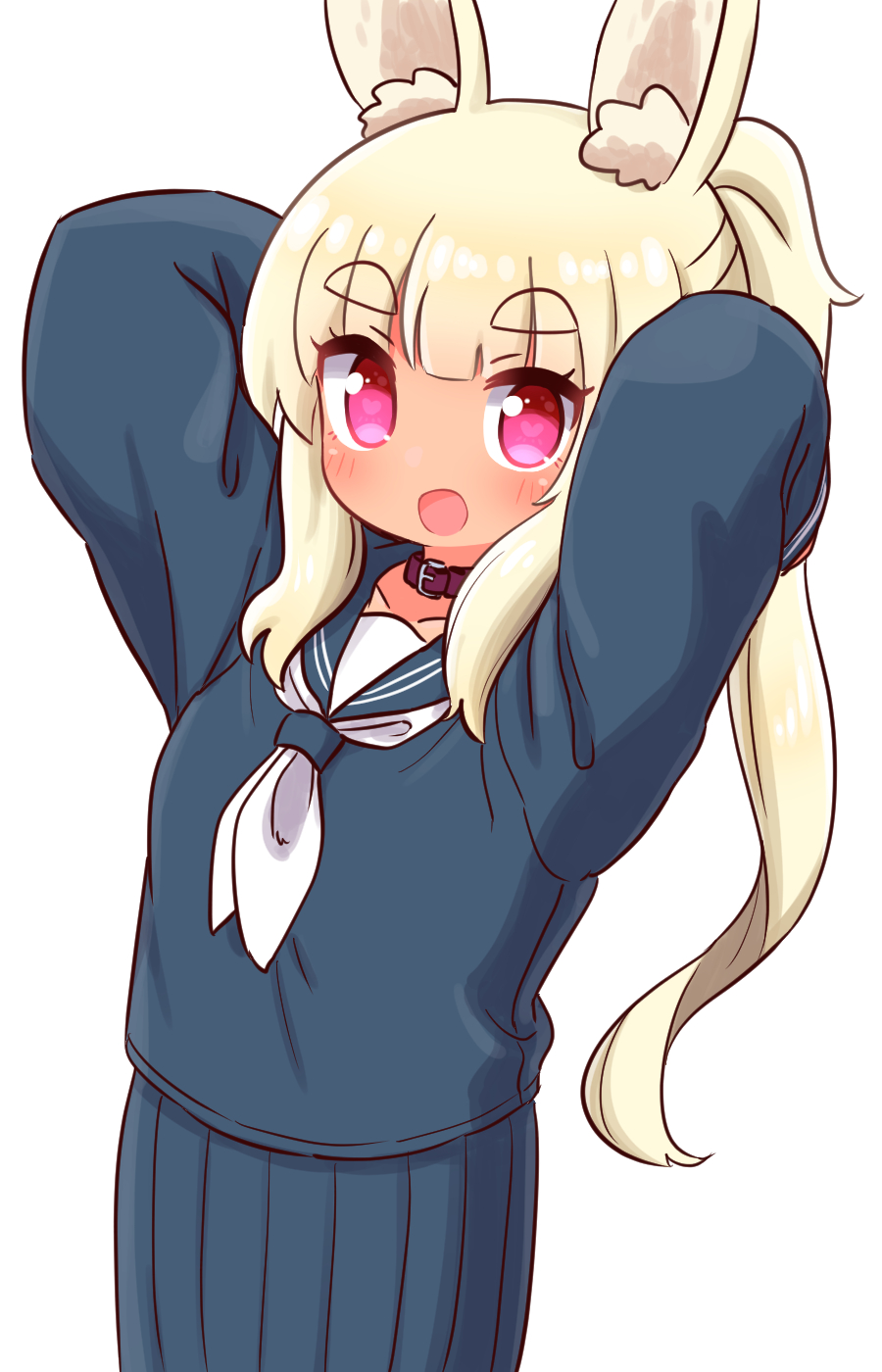 1girl animal_ear_fluff animal_ears arms_behind_head arms_up blonde_hair blue_sailor_collar blue_serafuku blue_shirt blue_skirt blunt_bangs blush breasts bright_pupils collar collarbone double_horizontal_stripe etrian_odyssey heart heart-shaped_pupils heart_in_eye highres long_hair long_sleeves looking_at_viewer masurao_(sekaiju) masurao_2_(sekaiju) naga_u neckerchief open_mouth pleated_skirt ponytail rabbit_ears red_collar red_eyes sailor_collar school_uniform sekaiju_no_meikyuu sekaiju_no_meikyuu_5 serafuku shirt sidelocks simple_background skirt small_breasts smile solo symbol-shaped_pupils symbol_in_eye thick_eyebrows very_long_hair white_background white_neckerchief