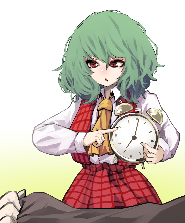 1girl alarm_clock ascot bad_id bad_pixiv_id clock collared_shirt eyeshadow gradient_background green_background green_hair holding kazami_yuuka long_skirt long_sleeves makeup mandarok1149 plaid_clothes plaid_skirt plaid_vest pointing red_eyes red_eyeshadow red_skirt red_vest shirt short_hair skirt skirt_set touhou vest white_shirt yellow_ascot