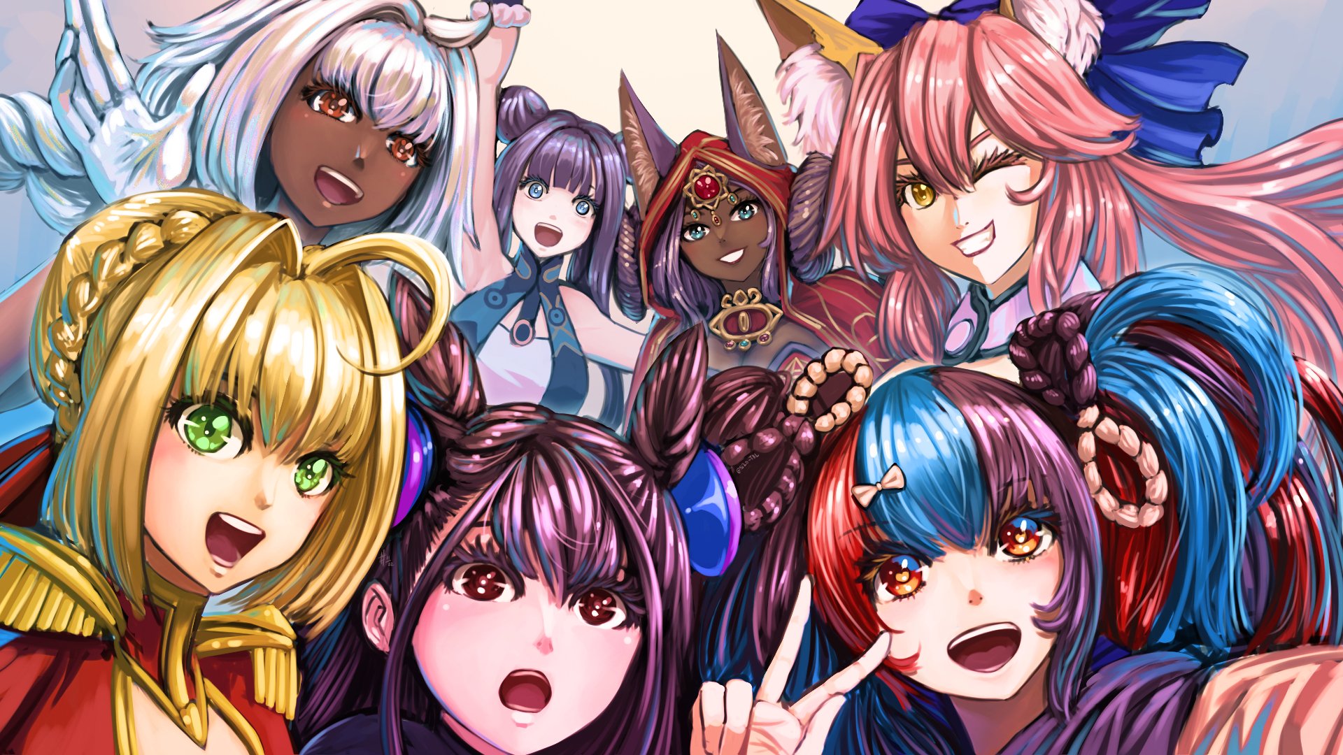 6+girls :d :o ahoge animal_ear_fluff animal_ears arm_up blonde_hair blue_eyes blue_hair braid brown_eyes caenis_(fate) character_request commentary cone_hair_bun crown_braid dark-skinned_female dark_skin double_bun ears_through_headwear english_commentary epaulettes fate/grand_order fate_(series) fox_ears gloves green_eyes grin hair_between_eyes hair_bun highres hood hood_up lakshmibai_(fate) lakshmibai_(first_ascension)_(fate) long_hair looking_at_viewer multicolored_hair multiple_girls nero_claudius_(fate) nero_claudius_(fate/extra) one_eye_covered open_mouth pink_hair purple_hair red_eyes red_hair sei_shounagon_(fate) sei_shounagon_(first_ascension)_(fate) single_hair_bun smile substance20 tamamo_no_mae_(fate) v white_gloves yang_guifei_(fate) yellow_eyes