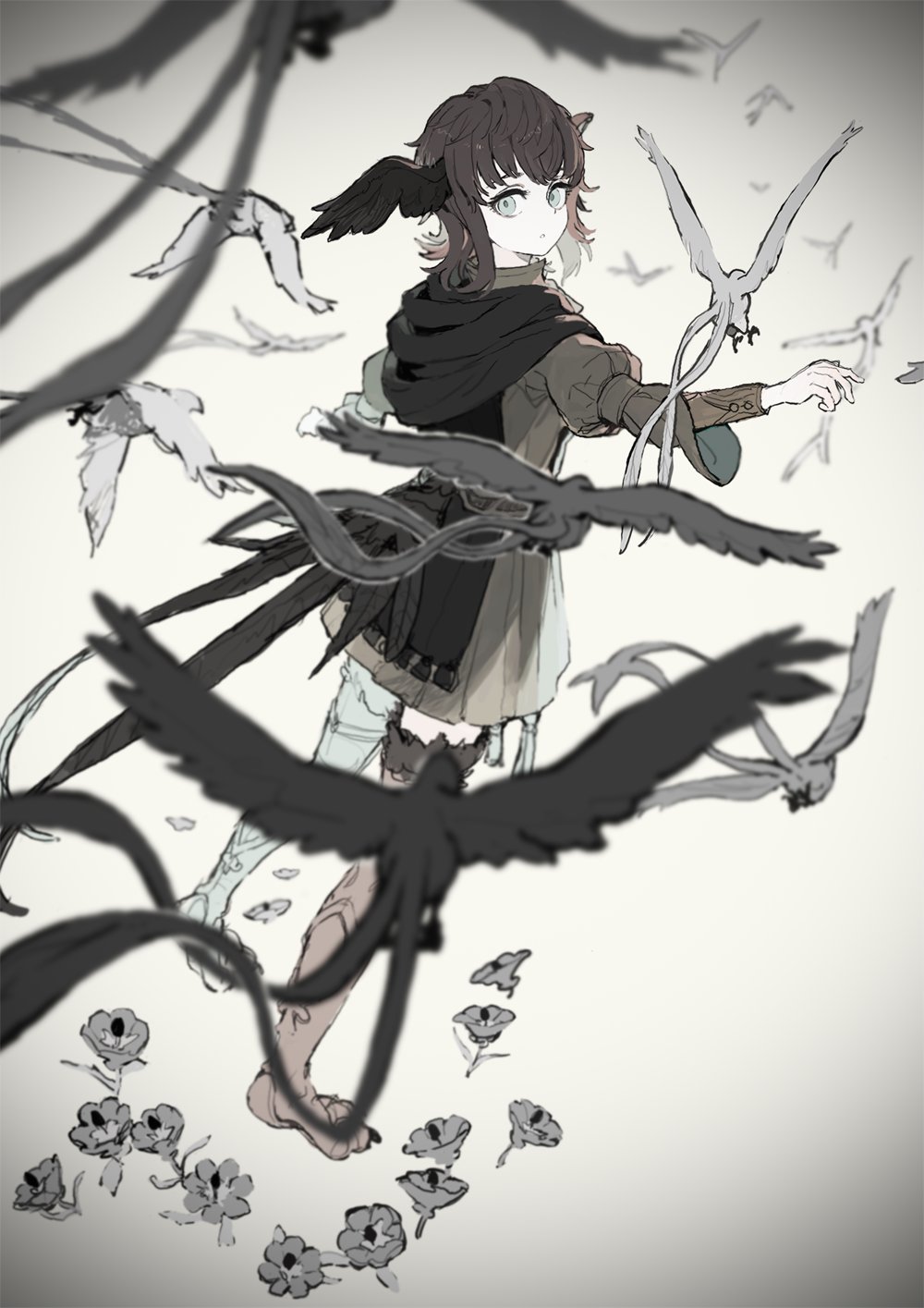 1girl atory_totory bird bird_girl bird_legs bird_tail bird_wings black_bird black_hair black_scarf blurry depth_of_field dress elpis_flower final_fantasy final_fantasy_xiv flower flying full_body gradient_background grey_background grey_dress grey_eyes grey_flower head_wings highres limited_palette looking_back meteion outstretched_arms scarf short_hair solo spoilers spread_arms tail walking wings