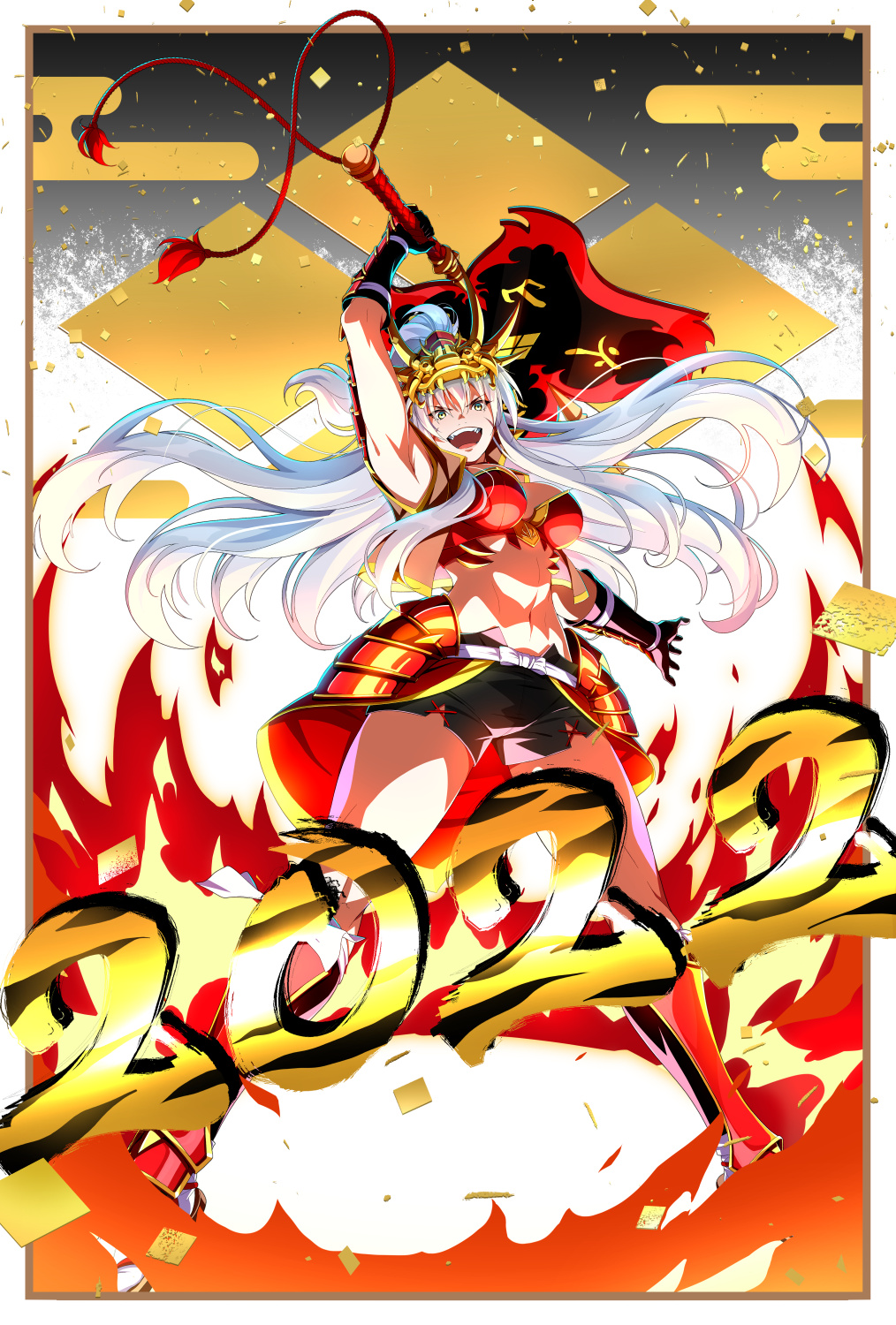 1girl 2022 animal_print arm_up armor armored_skirt black_gloves black_shorts breasts chinese_zodiac commentary crop_top egasumi fire full_body gauntlets gloves greaves hand_fan helmet highres holding holding_fan japanese_armor long_hair looking_at_viewer medium_breasts midriff navel new_year open_mouth overskirt qwel_08 red_footwear red_shirt red_skirt sengoku_otome shirt short_shorts shorts silver_hair skirt smile solo standing takeda_shingen_(sengoku_otome) tiger_print war_fan year_of_the_tiger