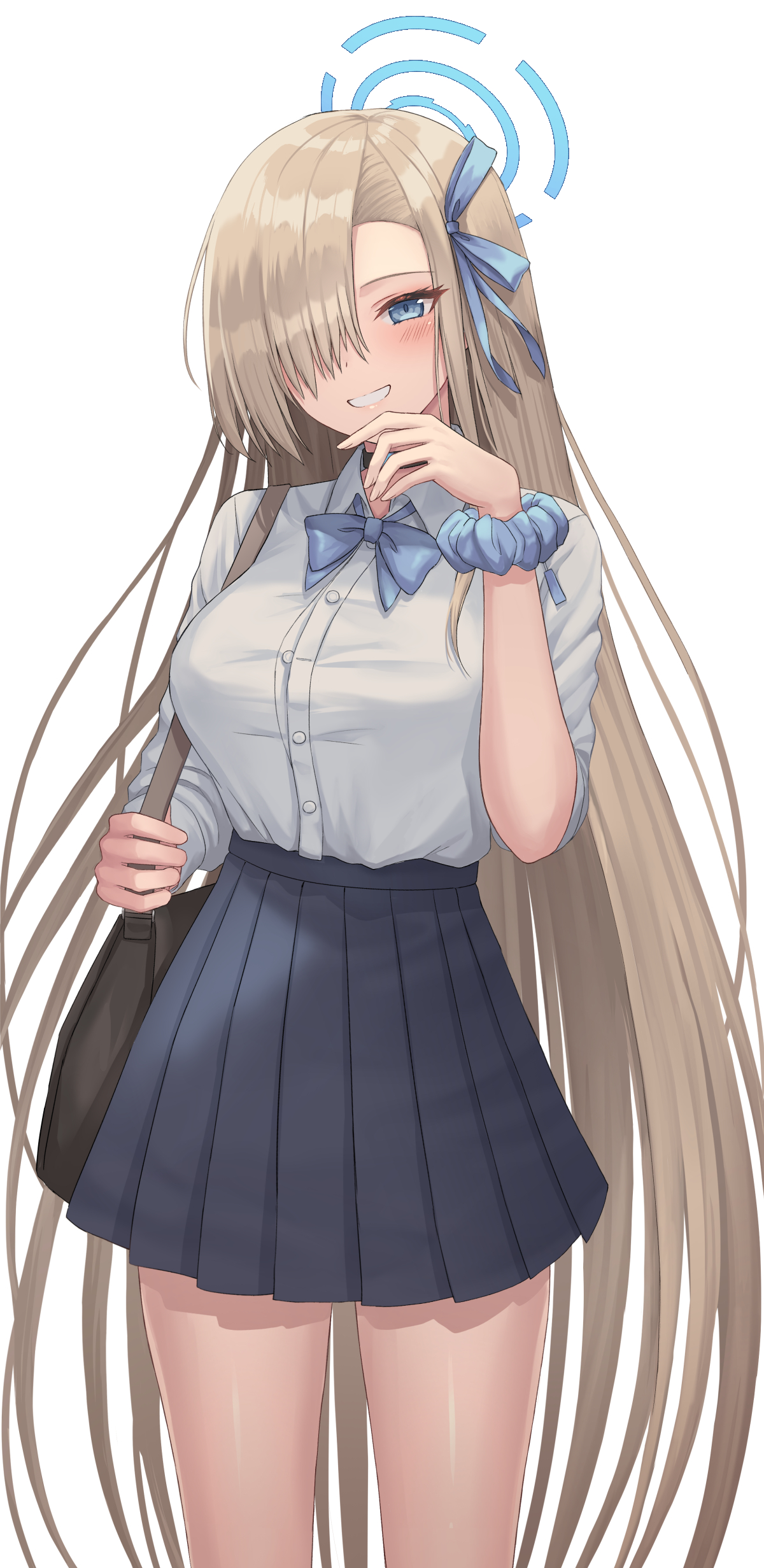 1girl absurdres asuna_(blue_archive) asuna_(school_uniform)_(blue_archive) bag black_choker blue_archive blue_bow blue_eyes blue_skirt blush bow breasts brown_bag choker collared_shirt cowboy_shot grin hair_bow hair_ornament hair_over_one_eye halo hand_on_own_face hand_up highres holding_strap light_brown_hair long_hair looking_at_viewer medium_breasts messenger_bag miniskirt official_alternate_costume open_mouth pleated_skirt scrunchie seungju_lee shirt short_sleeves shoulder_bag simple_background skirt smile solo straight_hair tented_shirt very_long_hair white_background white_shirt wing_collar