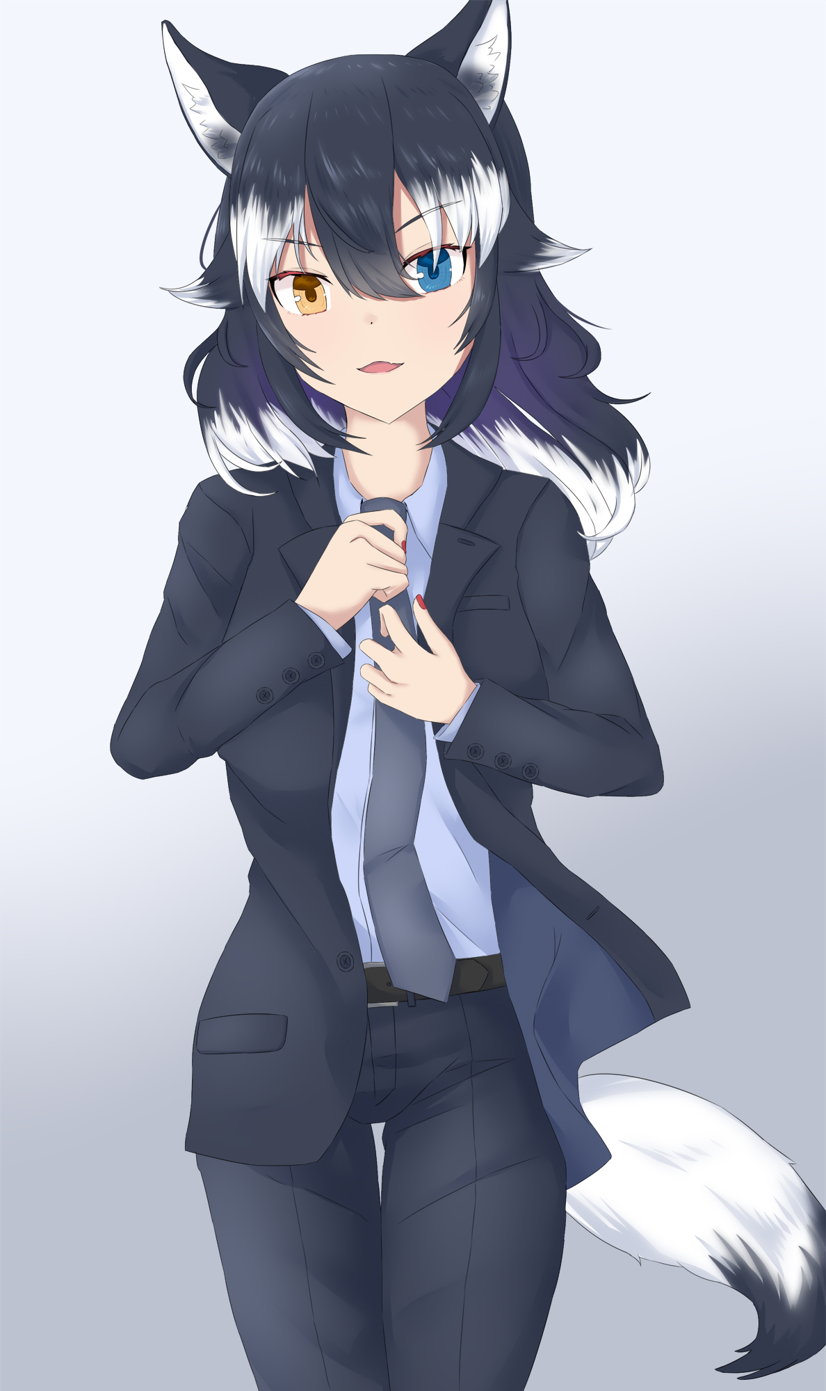 1girl animal_ears belt black_hair black_pants black_suit blue_eyes brown_belt buttons clothes_grab collared_shirt commentary_request feet_out_of_frame formal_clothes gradient_background grey_necktie grey_wolf_(kemono_friends) hair_between_eyes heterochromia highres jacket kemono_friends long_hair maindo_(mindrmindr) multicolored_hair nail_polish necktie necktie_grab neckwear_grab open_mouth orange_eyes pants red_nails shirt smile solo standing streaked_hair suit suit_jacket tail v-shaped_eyebrows white_background white_hair white_shirt wolf_ears wolf_girl wolf_tail