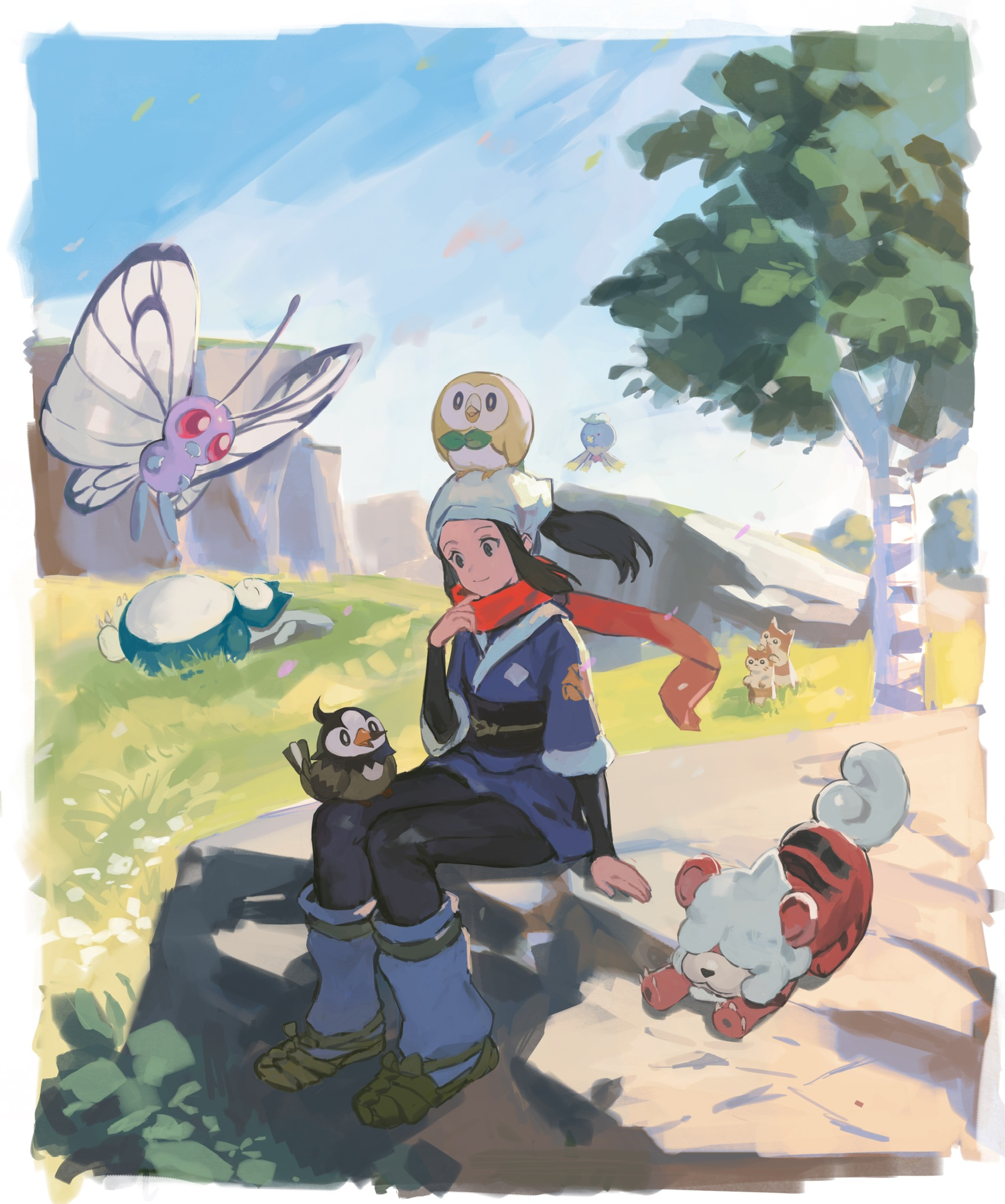 1girl akari_(pokemon) black_hair butterfree drifblim furret galaxy_expedition_team_survey_corps_uniform gen_1_pokemon gen_2_pokemon gen_4_pokemon gen_7_pokemon hashibiro_kou_(garapiko_p) headscarf highres hisuian_growlithe jacket long_hair nintendo pokemon pokemon_(creature) pokemon_legends:_arceus red_scarf rowlet sash scarf sitting snorlax tree white_headscarf white_headwear