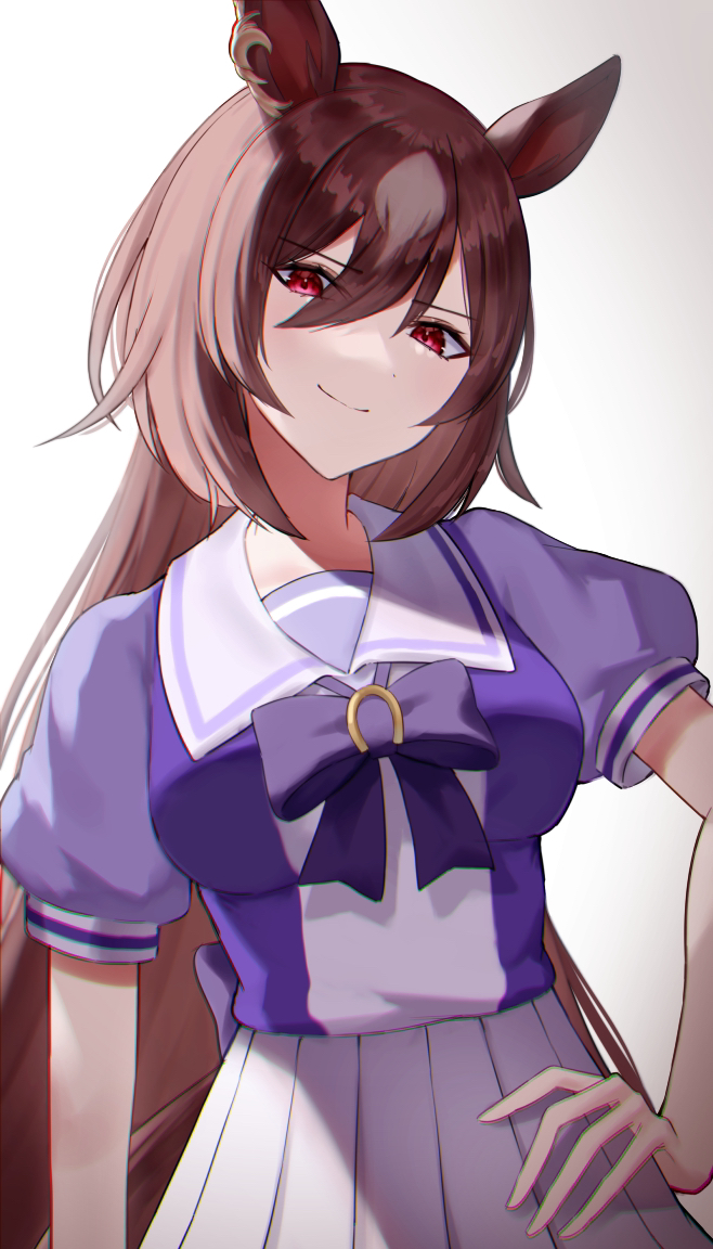 1girl animal_ears blouse breasts brown_hair hair_between_eyes hand_on_own_hip horse_ears horse_girl horse_tail large_breasts looking_at_viewer purple_shirt red_eyes school_uniform serafuku shirt simple_background sirius_symboli_(umamusume) skirt smile tail umamusume white_background yoimoriyoru