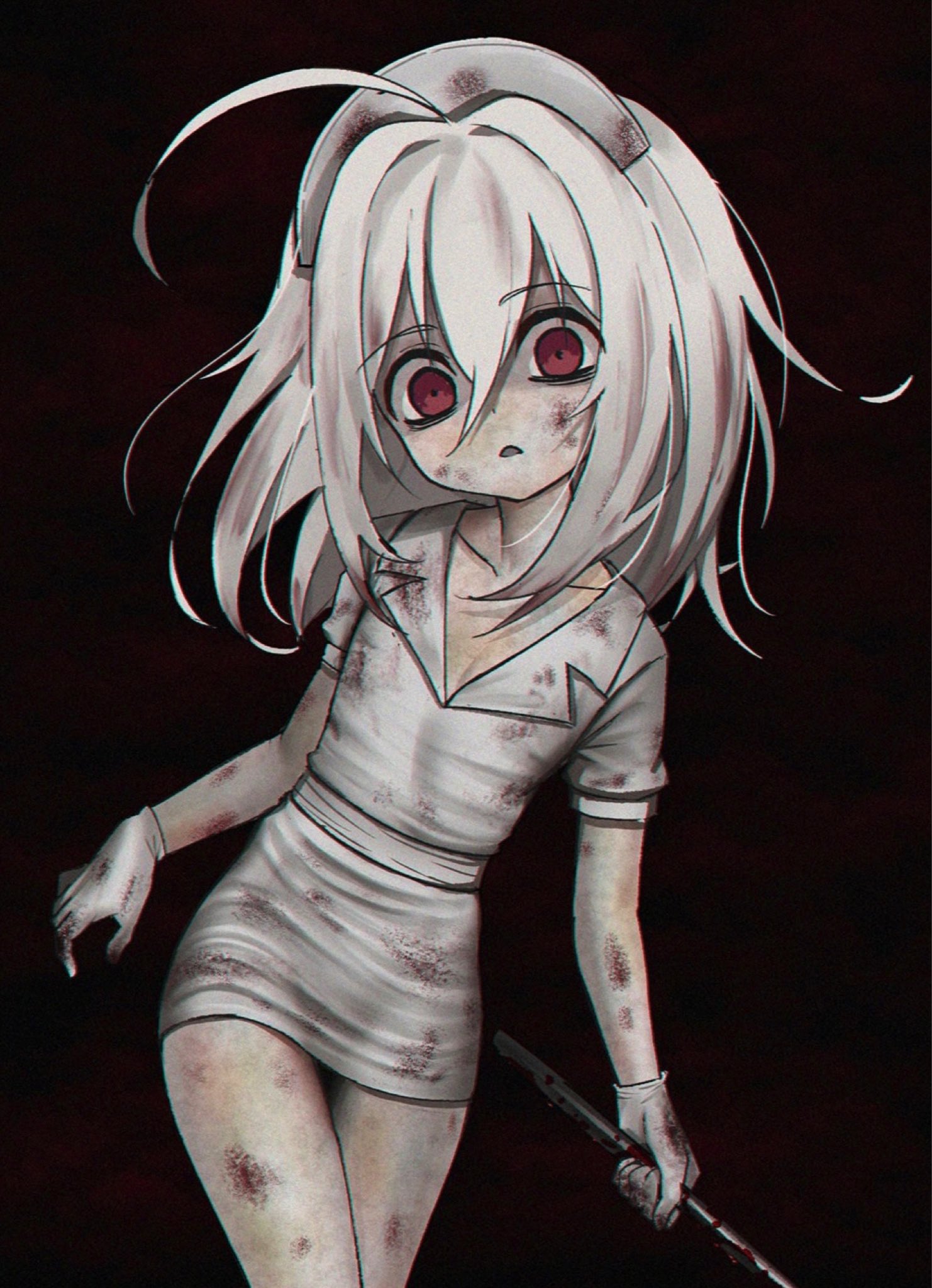 1girl cosplay cowboy_shot dirty dirty_clothes eha7y flat_chest gloves hat highres long_hair looking_at_viewer nurse nurse_(silent_hill) nurse_(silent_hill)_(cosplay) nurse_cap original parted_lips red_eyes scar silent_hill silent_hill_(series) solo wasabi-chan_(eha7y) white_hair
