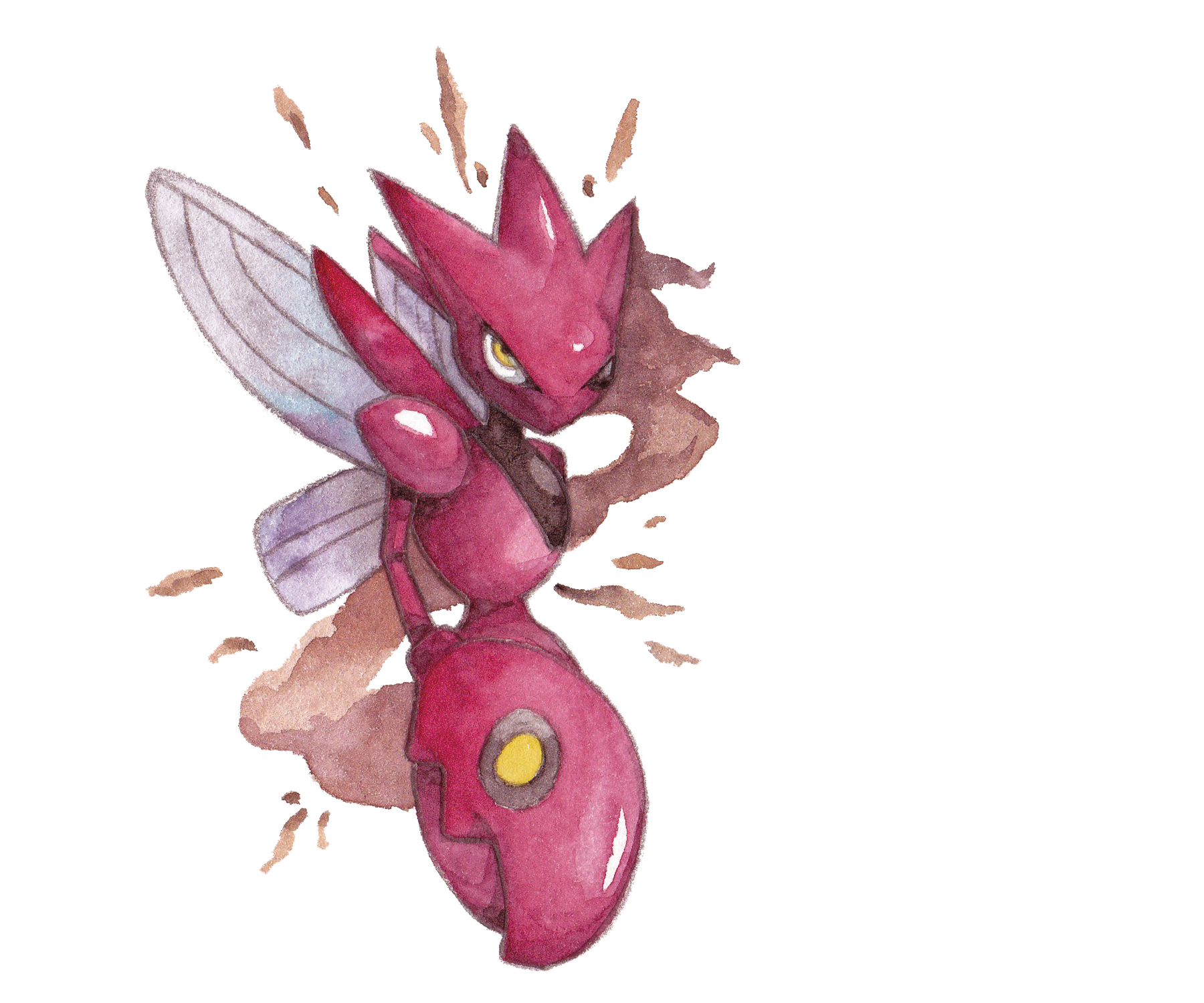 commentary_request gen_2_pokemon harinezumi_(hedgehog_25) highres looking_to_the_side nintendo no_humans painting_(medium) pincers pokemon pokemon_(creature) scizor simple_background solo spikes traditional_media watercolor_(medium) white_background yellow_eyes