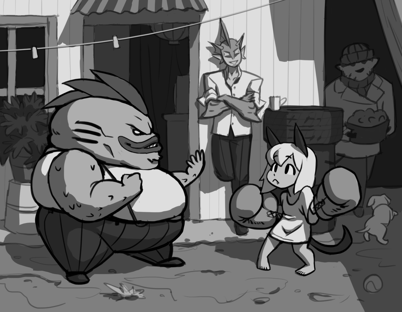 1girl 3boys baseball basket beanie boxing_gloves cat_girl coffee_mug crossed_arms cup dog dress fish_boy hat ms._fortune_(skullgirls) mug multiple_boys noonun outdoors plant potted_plant skullgirls smile suspenders window aged_down