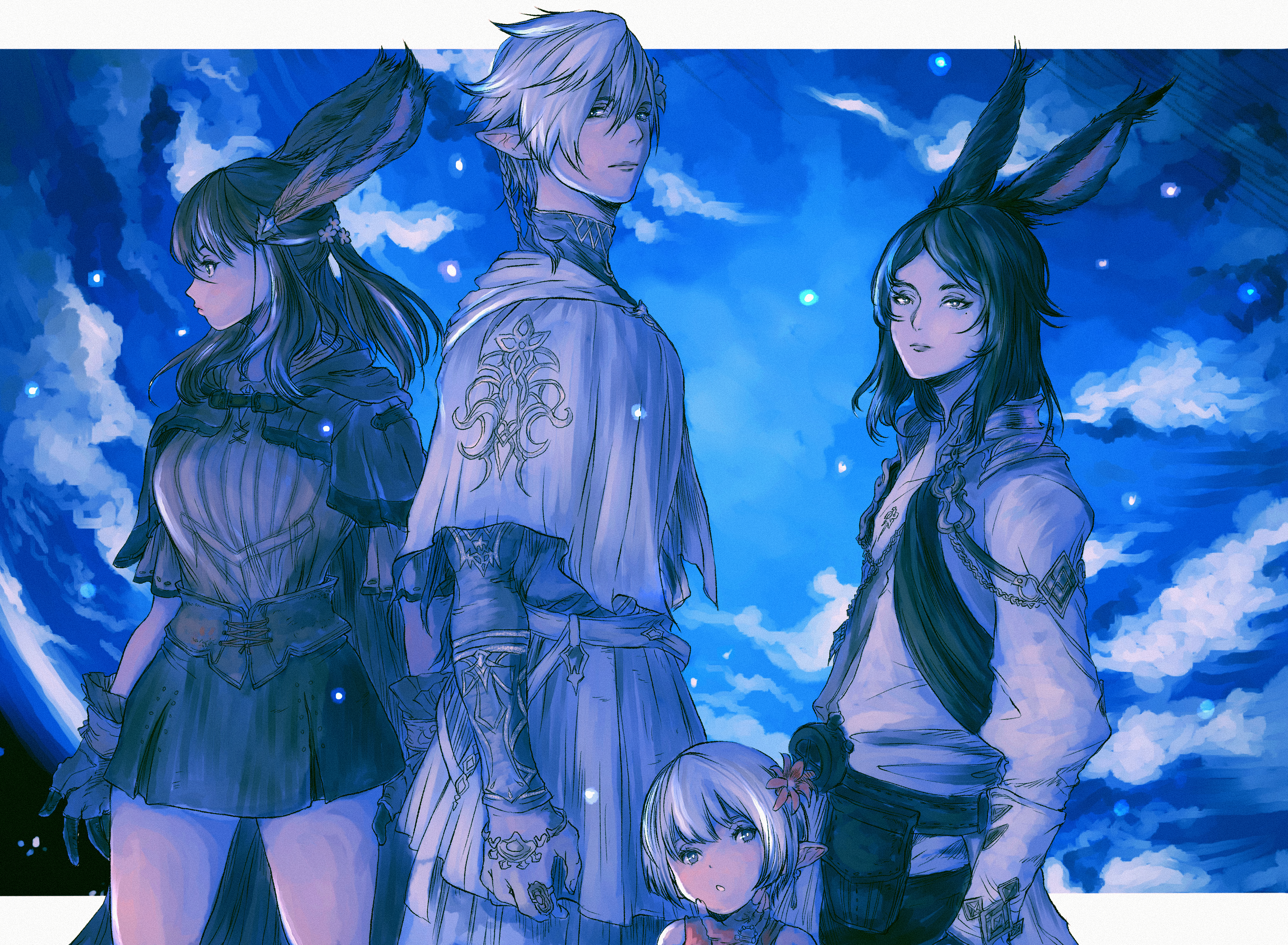 1boy 3girls absurdres animal_ears warrior_of_light_(ff14) black_hair blue_eyes brown_hair capelet commentary earrings elezen elf english_commentary feather_hair_ornament feathers final_fantasy final_fantasy_xiv flower gloves gusty10rk hair_between_eyes hair_flower hair_ornament highres jewelry lalafell long_hair looking_at_viewer multiple_girls parted_bangs pointy_ears rabbit_ears short_hair skirt viera white_hair yellow_eyes
