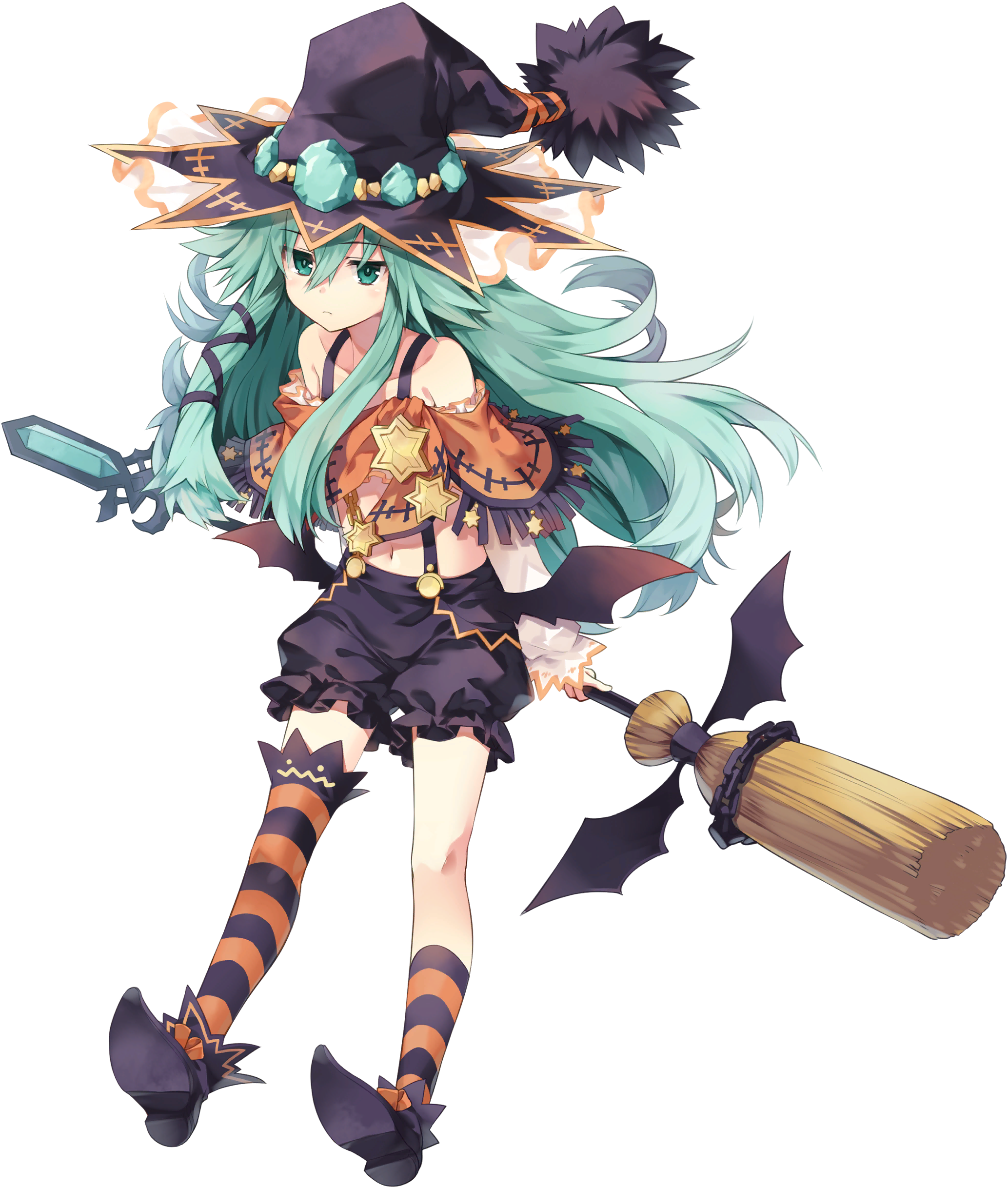 10s 1girl :< absurdres aged_down bat_wings child date_a_live flat_chest gem green_eyes green_hair hat highres long_hair matching_hair/eyes kyouno_natsumi navel official_art simple_background solo star_(symbol) striped_clothes striped_thighhighs thighhighs triangle_mouth tsunako white_background wings witch_hat