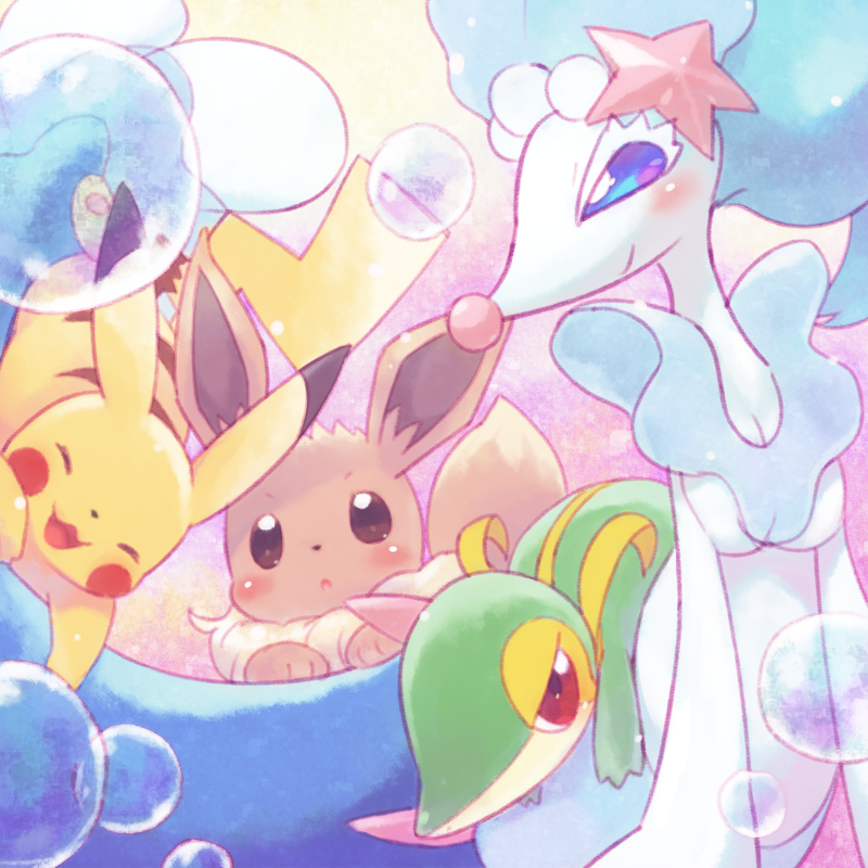 blue_eyes blush breasts brown_eyes bubble closed_eyes closed_mouth colorful eevee gen_1_pokemon gen_5_pokemon gen_7_pokemon hair_ornament lying_on_person medium_breasts mizuki_kotora nintendo no_humans open_mouth pastel_colors pikachu pink_background pokemon pokemon_(creature) primarina red_eyes smile snivy star_(symbol) star_hair_ornament yellow_background
