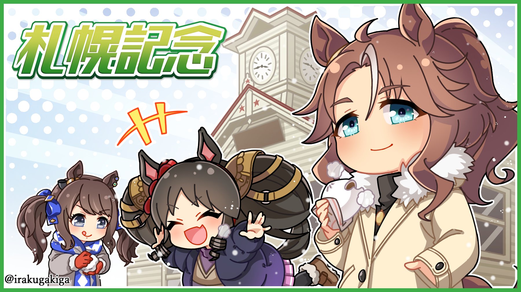 +++ 3girls animal_ears steamed_bun black_hair blue_coat blue_eyes blush boots border brown_coat brown_hair building chibi clock clock_tower closed_eyes coat fang food gloves green_border hand_in_pocket highres horse_ears horse_girl horse_tail looking_at_viewer marvelous_sunday_(umamusume) mejiro_palmer_(umamusume) multiple_girls nihudau open_mouth outstretched_arms pleated_skirt ponytail red_gloves scarf skin_fang skirt smile snowball snowing spread_arms steam tail tongue tongue_out tosen_jordan_(umamusume) tower twintails twitter_username umamusume winter_clothes winter_coat